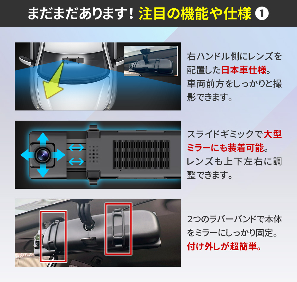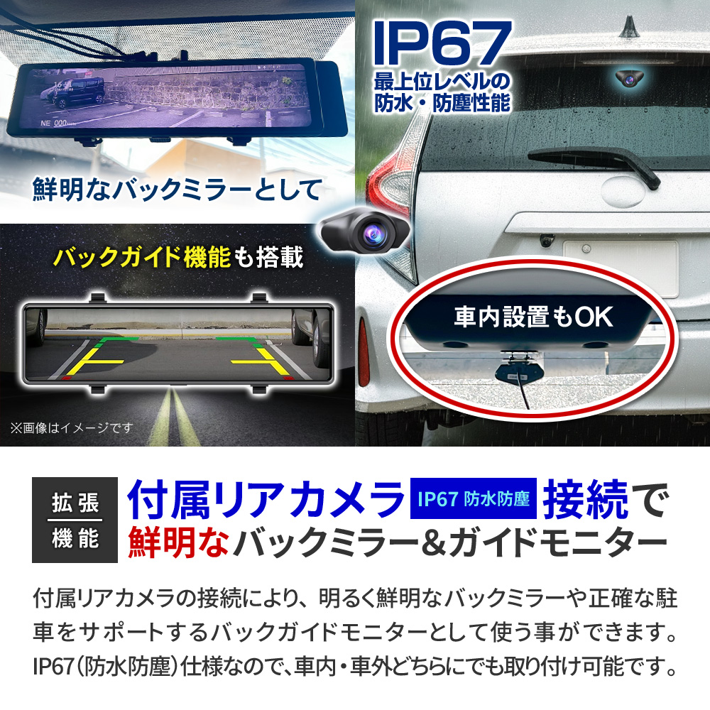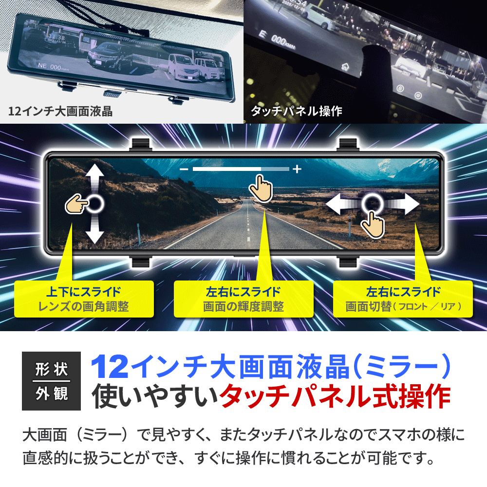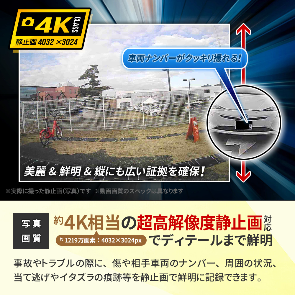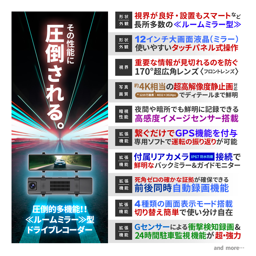 ・12インチ 大画面液晶 ・直感的なタッチパネル操作 ┗表示や設定をいつでも変更可能 ・FHD1080P規格 動画撮影 ・Motion JPEG コーデック ・AVI動画ファイル ・フレームレート30FPS(最大) ・4K級 高画質静止画撮影 ・前後超広角レンズ(約170°/約120°) ・低照度暗視補正機能 ┗夜間も鮮明な高感度イメージセンサー ・逆光補正機能(WDR/HDR) ・エンジン連動 自動録画機能 ・[自動]動画 前後同時録画機能 ・[手動]静止画 前後同時撮影機能 ・バックガイド機能 ・GPS機能(専用PCソフト有) ┗位置情報、ルート、速度を確認可能 ・Gセンサー(加速度センサー)搭載 ┗衝撃検知録画機能 ┗24時間駐車監視機能 ・緊急録画モード搭載(上書きロック) ・繰り返し録画機能 ・microSDカード最大64GB対応 ・IP67防水防塵(リアカメラのみ) ・日本国内信号機(50Hz/60Hz)対応 ┗信号の点滅もしっかり録画 ・地デジ ノイズ対応(電波干渉抑制) ・日本車仕様(右ハンドルレンズ) ・スライドギミック搭載(大型ミラー対応) ・フロントレンズ手動調整可能 ・着脱簡単なラバーバンド固定式 他多数 |