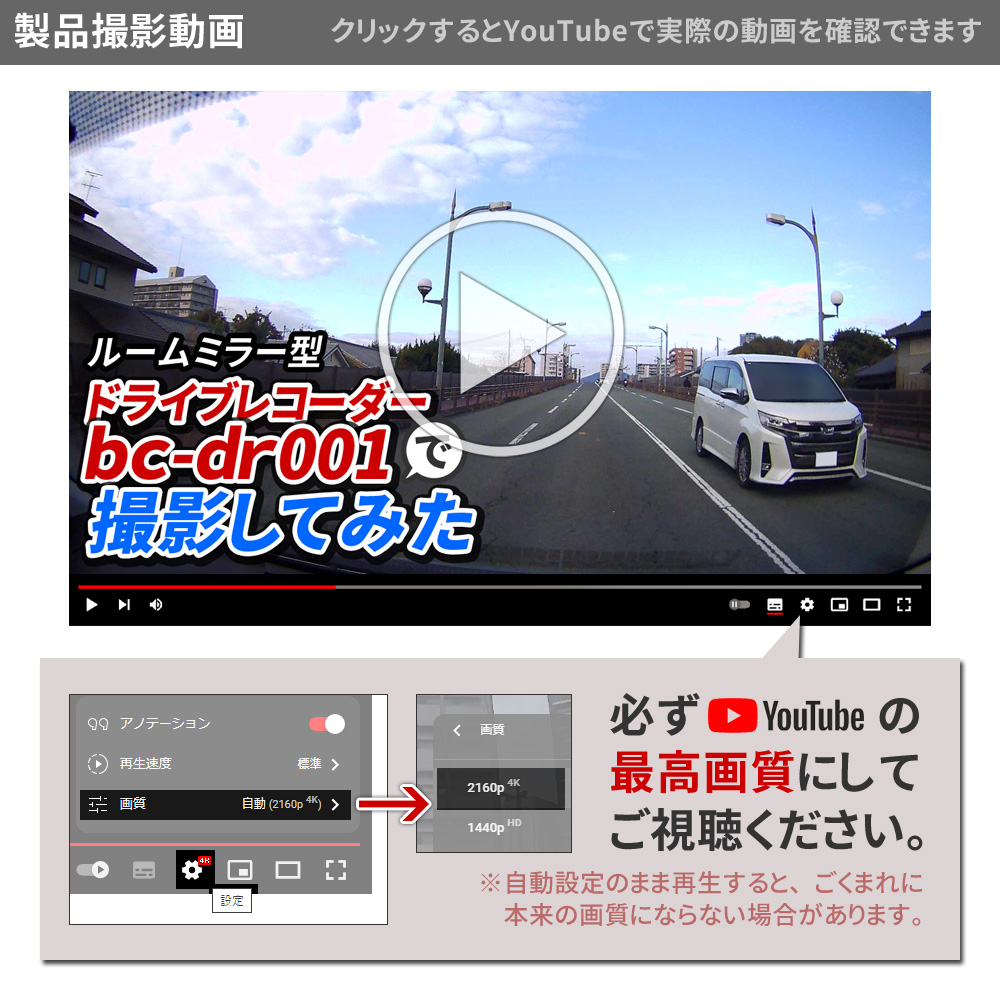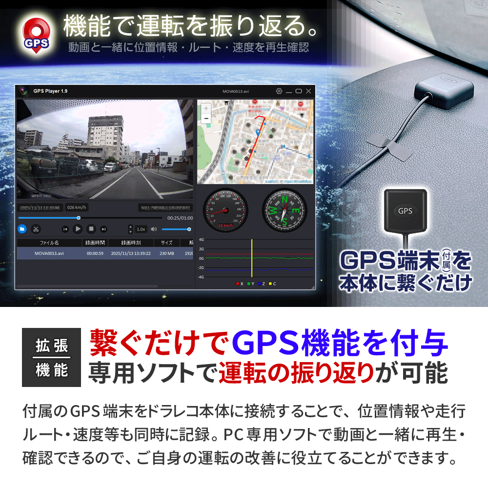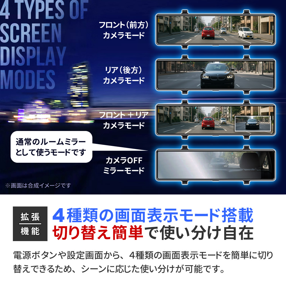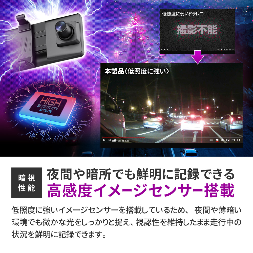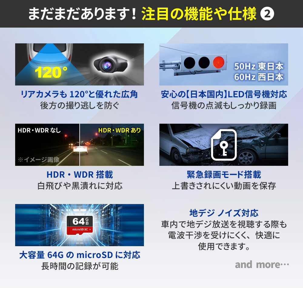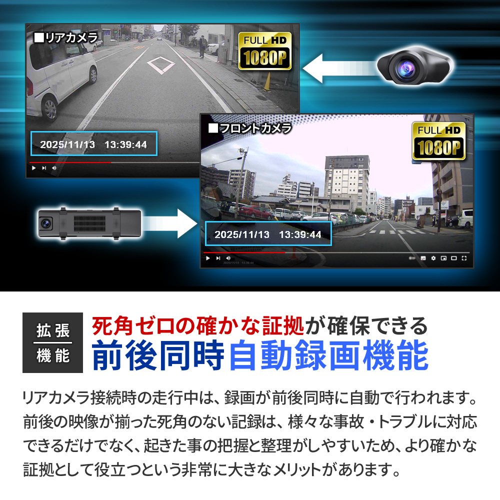 ・12インチ 大画面液晶 ・直感的なタッチパネル操作 ┗表示や設定をいつでも変更可能 ・FHD1080P規格 動画撮影 ・Motion JPEG コーデック ・AVI動画ファイル ・フレームレート30FPS(最大) ・4K級 高画質静止画撮影 ・前後超広角レンズ(約170°/約120°) ・低照度暗視補正機能 ┗夜間も鮮明な高感度イメージセンサー ・逆光補正機能(WDR/HDR) ・エンジン連動 自動録画機能 ・[自動]動画 前後同時録画機能 ・[手動]静止画 前後同時撮影機能 ・バックガイド機能 ・GPS機能(専用PCソフト有) ┗位置情報、ルート、速度を確認可能 ・Gセンサー(加速度センサー)搭載 ┗衝撃検知録画機能 ┗24時間駐車監視機能 ・緊急録画モード搭載(上書きロック) ・繰り返し録画機能 ・microSDカード最大64GB対応 ・IP67防水防塵(リアカメラのみ) ・日本国内信号機(50Hz/60Hz)対応 ┗信号の点滅もしっかり録画 ・地デジ ノイズ対応(電波干渉抑制) ・日本車仕様(右ハンドルレンズ) ・スライドギミック搭載(大型ミラー対応) ・フロントレンズ手動調整可能 ・着脱簡単なラバーバンド固定式 他多数 |