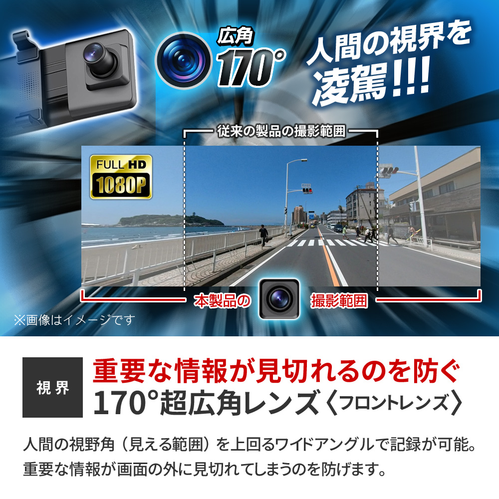 フロント:約170° / リア:約120° ※視野角は実測による。 |