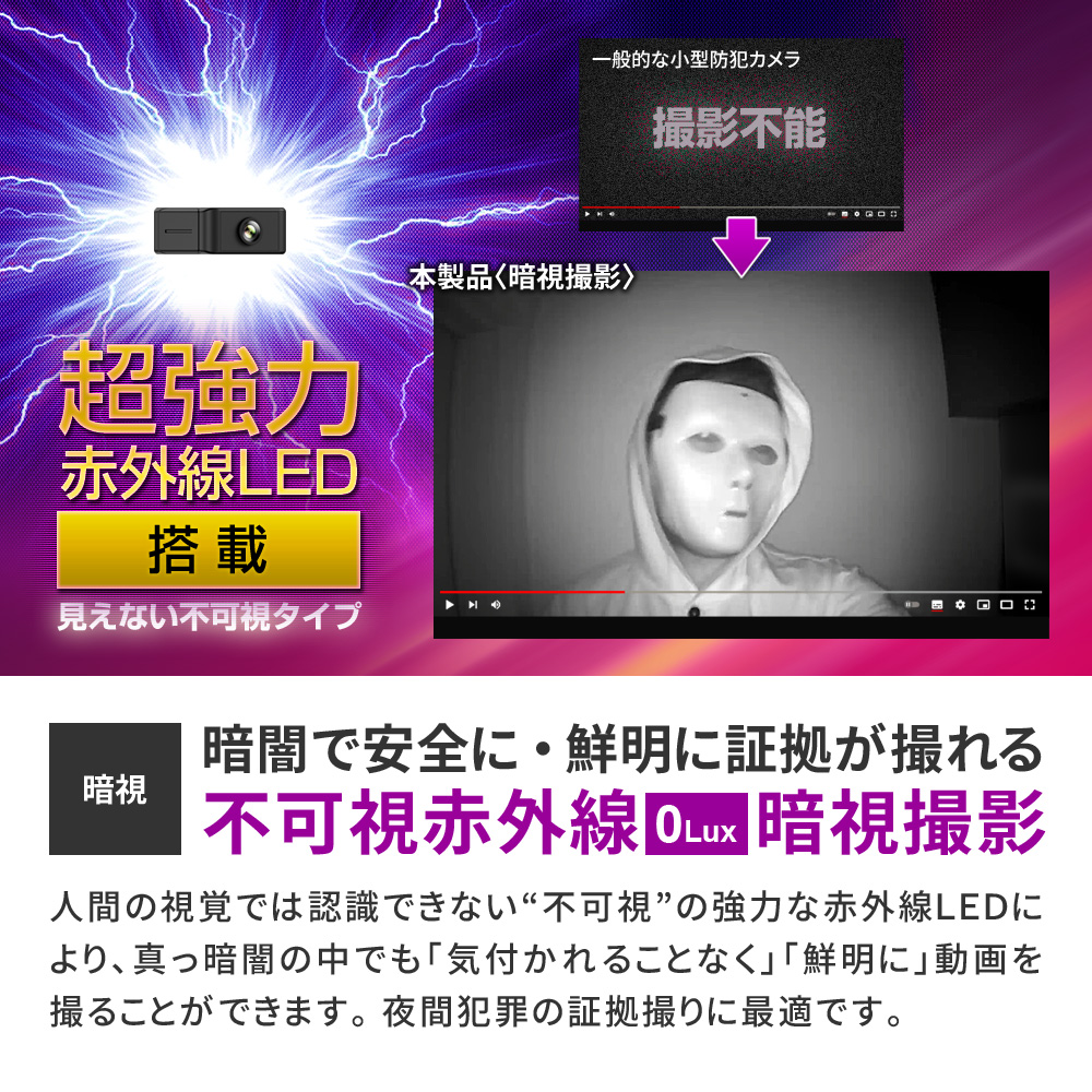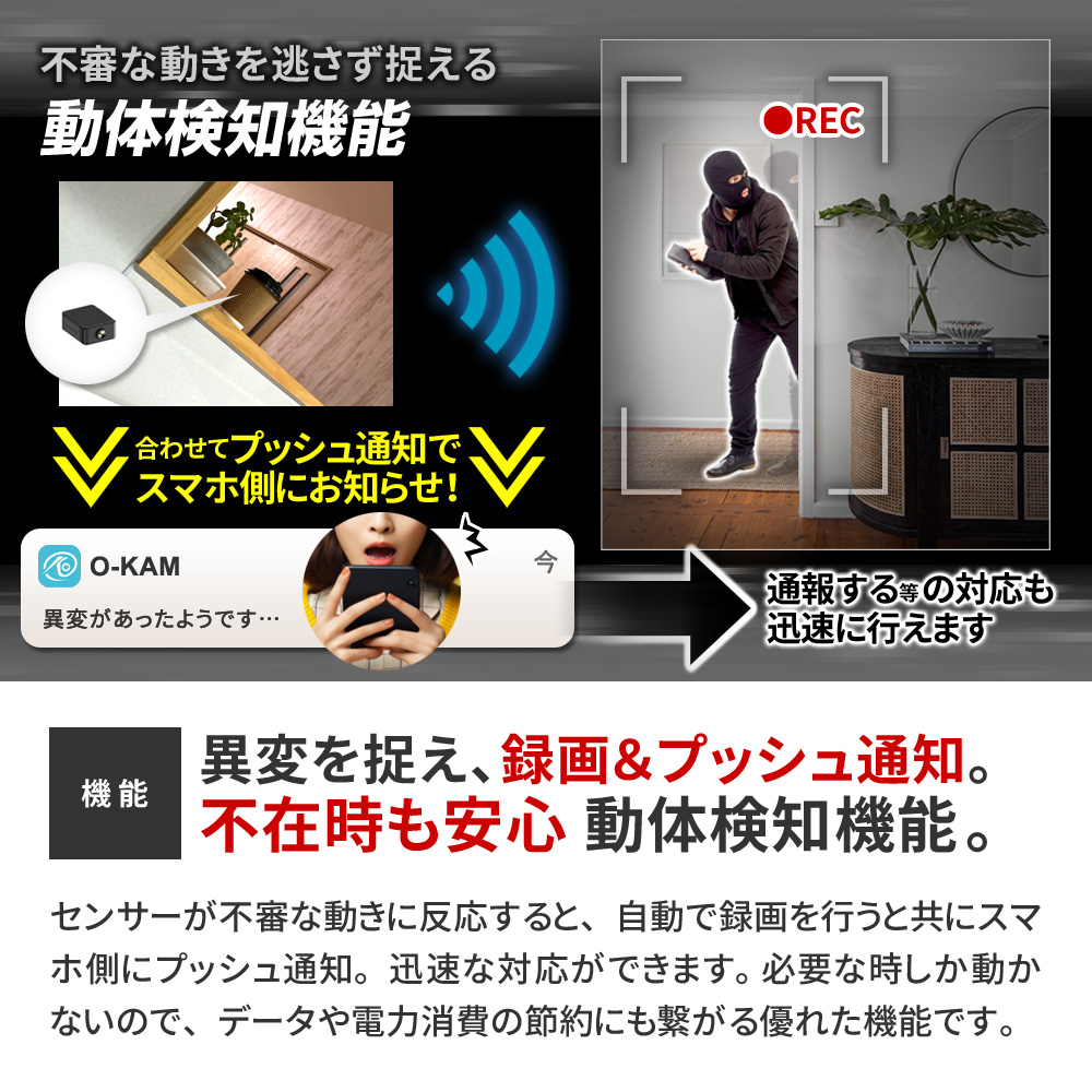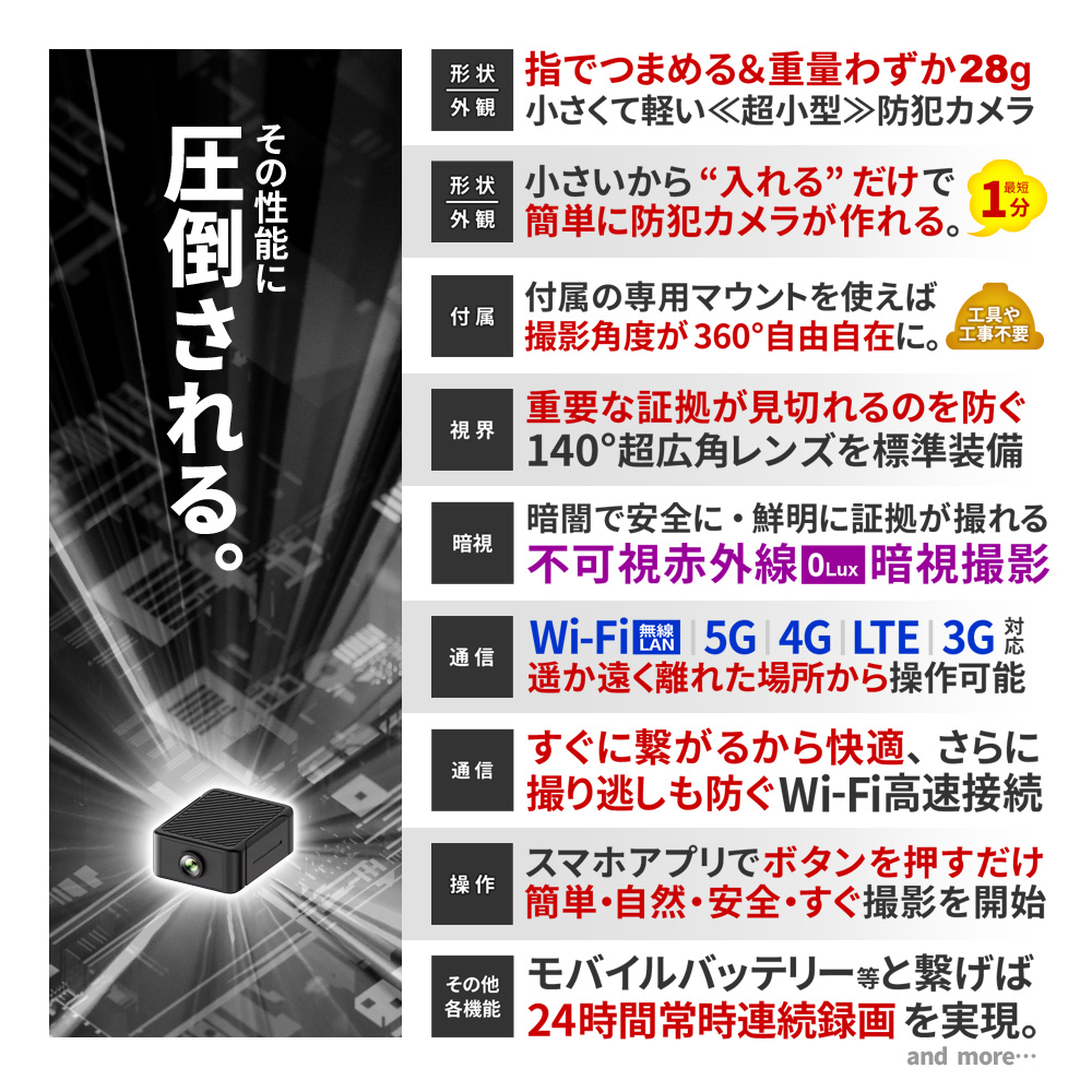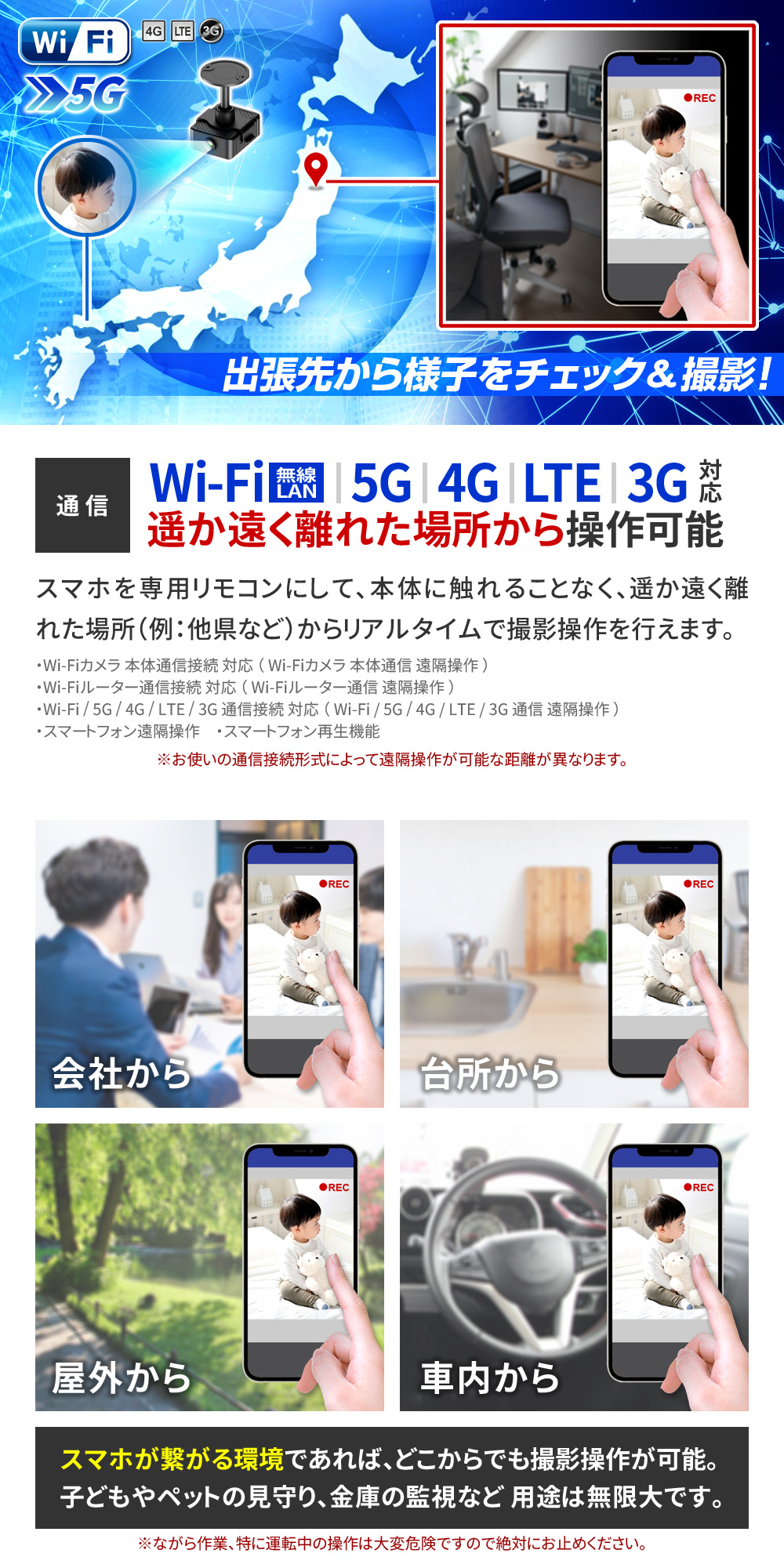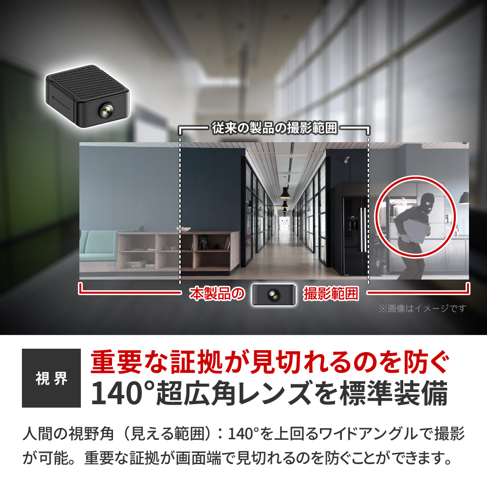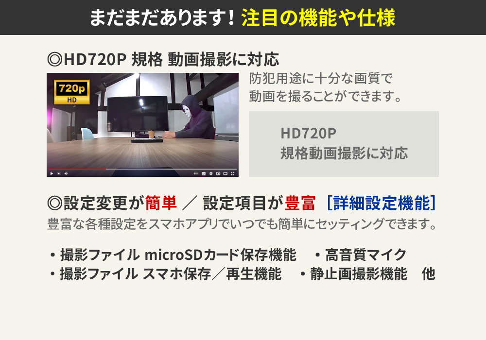 ・Wi-Fi カメラ本体通信 遠隔操作 ・Wi-Fi ルーター通信 遠隔操作 ・Wi-Fi 3G・4G・5G・LTE通信 遠隔操作 ・Wi-Fi高速接続 ・HD720P規格 動画撮影 ・広角140°レンズ ・H.264/MPEG-4 AVC コーデック ・不可視 赤外線LED暗視撮影機能 ・動体検知機能(プッシュ通知付き) ・繰り返し録画機能 ・外部電源 24時間連続録画機能 ・自動監視システム ・静止画撮影機能 ・microSDカード最大256GB対応 ・簡単設定機能 ・撮影ファイル スマホ保存機能 ・撮影ファイル スマホ再生機能 ・撮影ファイル microSDカード保存機能 ・詳細設定機能 ・簡単操作 ・専用マウント |