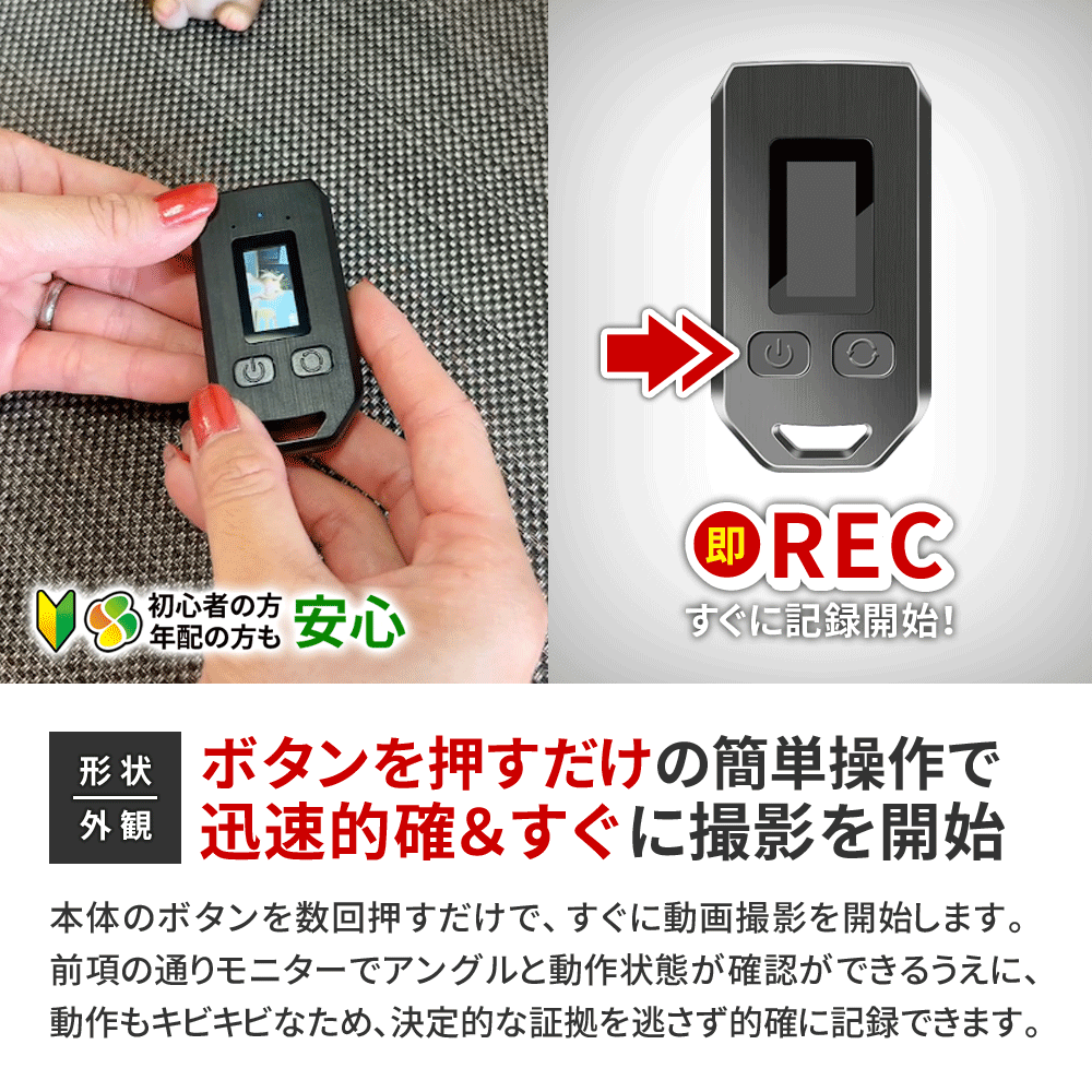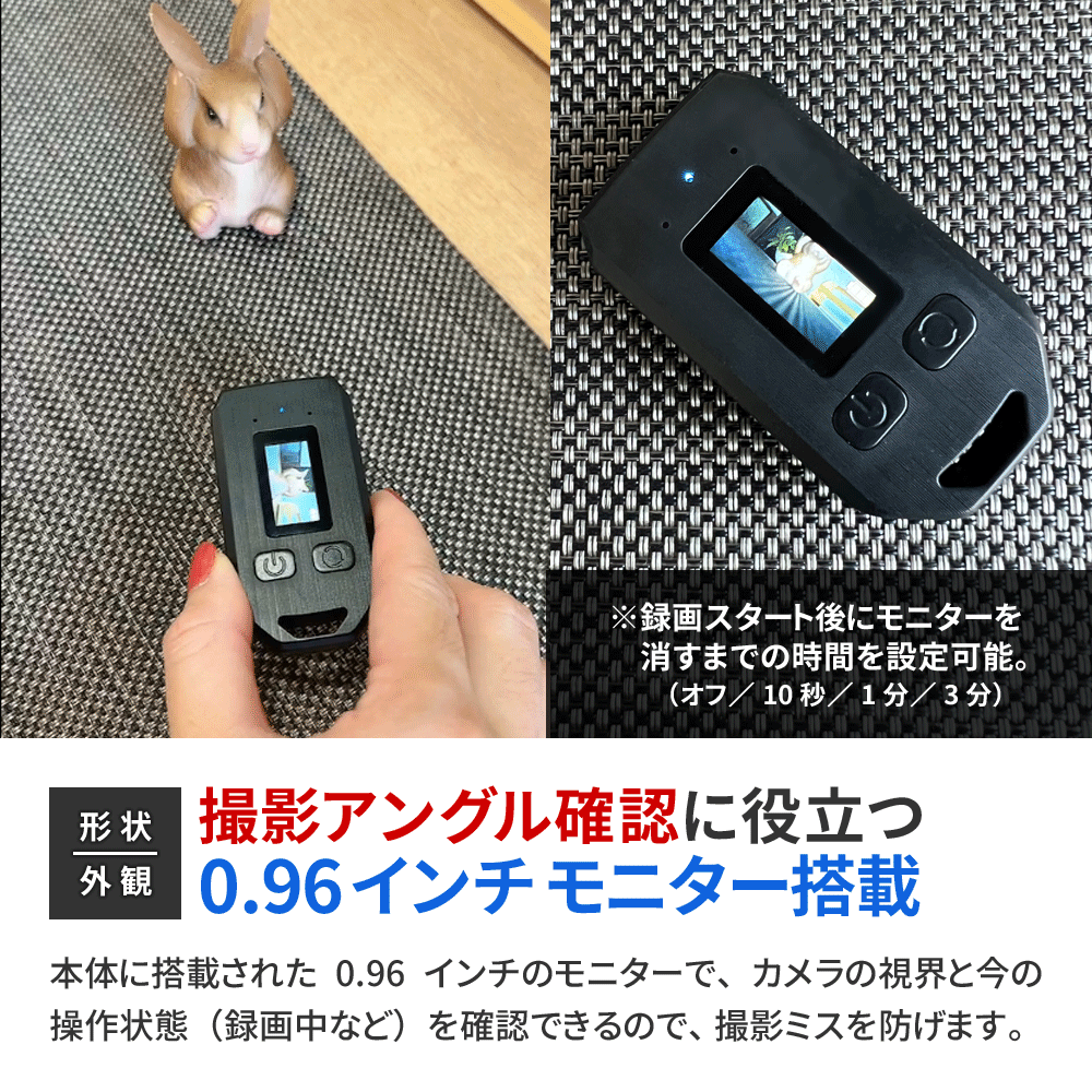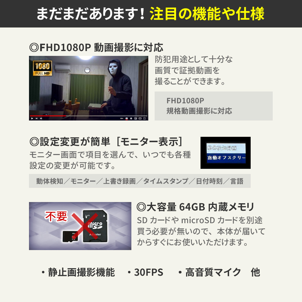 ・FHD1080P規格 動画撮影 ・H.264/MPEG-4 AVC コーデック ・フレームレート30FPS(最大) ・動体検知機能 ・繰り返し録画機能 ・外部電源 24時間連続録画機能 ・自動監視システム ・静止画撮影機能 ・0.96インチ モニター搭載 ・大容量64GB内蔵メモリ ・高音質マイク ・各種設定機能[モニター] ┗動体検知 ON/OFF ┗モニターの消える時間の設定 ┗繰り返し録画(上書き録画) ON/OFF ┗タイムスタンプの表示/非表示 ┗時刻設定 ┗言語設定 |