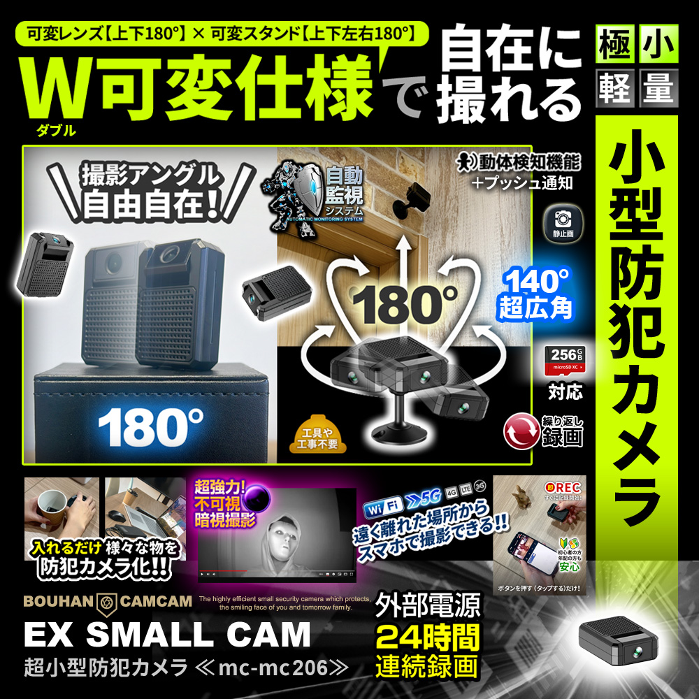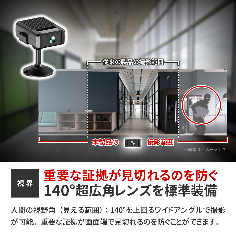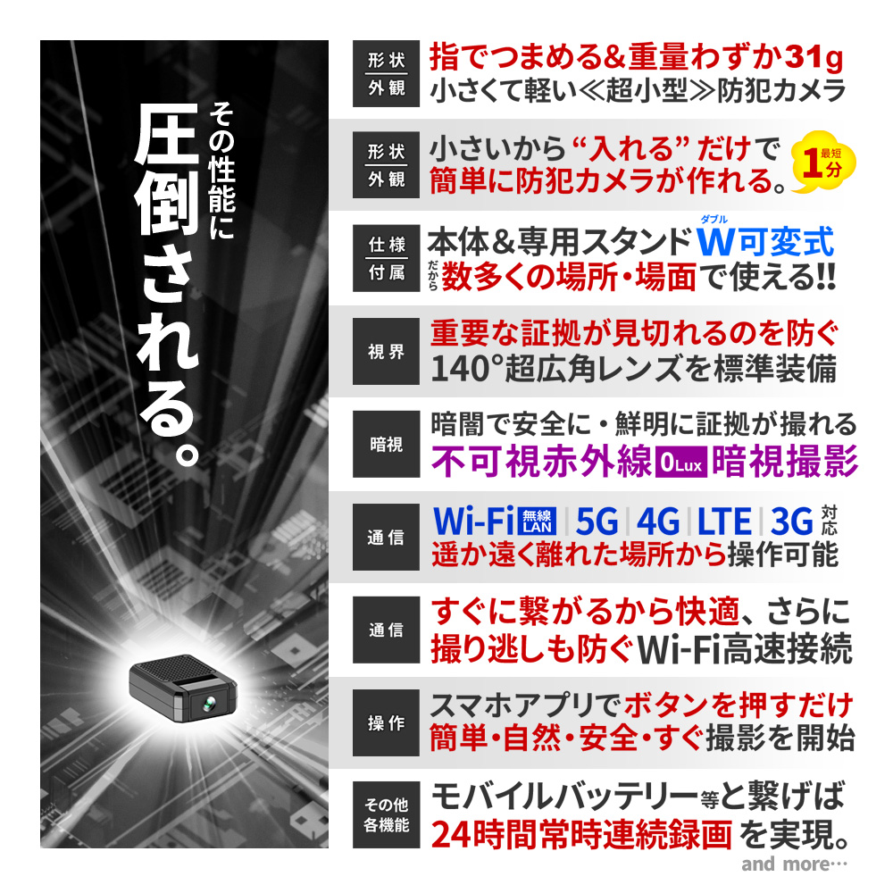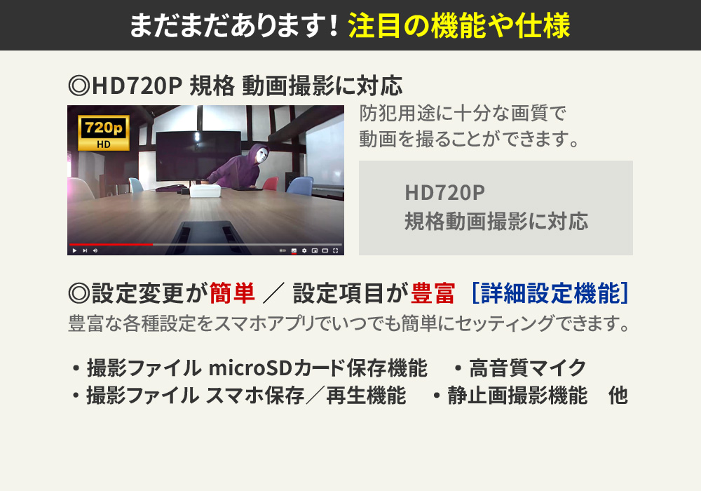 ・Wi-Fi カメラ本体通信 遠隔操作 ・Wi-Fi ルーター通信 遠隔操作 ・Wi-Fi 3G・4G・5G・LTE通信 遠隔操作 ・Wi-Fi高速接続 ・HD720P規格 動画撮影 ・広角140°レンズ(上下180°可変式) ・H.264/MPEG-4 AVC コーデック ・不可視 赤外線LED暗視撮影機能 ・動体検知機能(プッシュ通知付き) ・繰り返し録画機能 ・外部電源 24時間連続録画機能 ・自動監視システム ・静止画撮影機能 ・microSDカード最大256GB対応 ・簡単設定機能 ・撮影ファイル スマホ保存機能 ・撮影ファイル スマホ再生機能 ・撮影ファイル microSDカード保存機能 ・詳細設定機能 ・簡単操作 ・マグネット内蔵 ・専用スタンド |