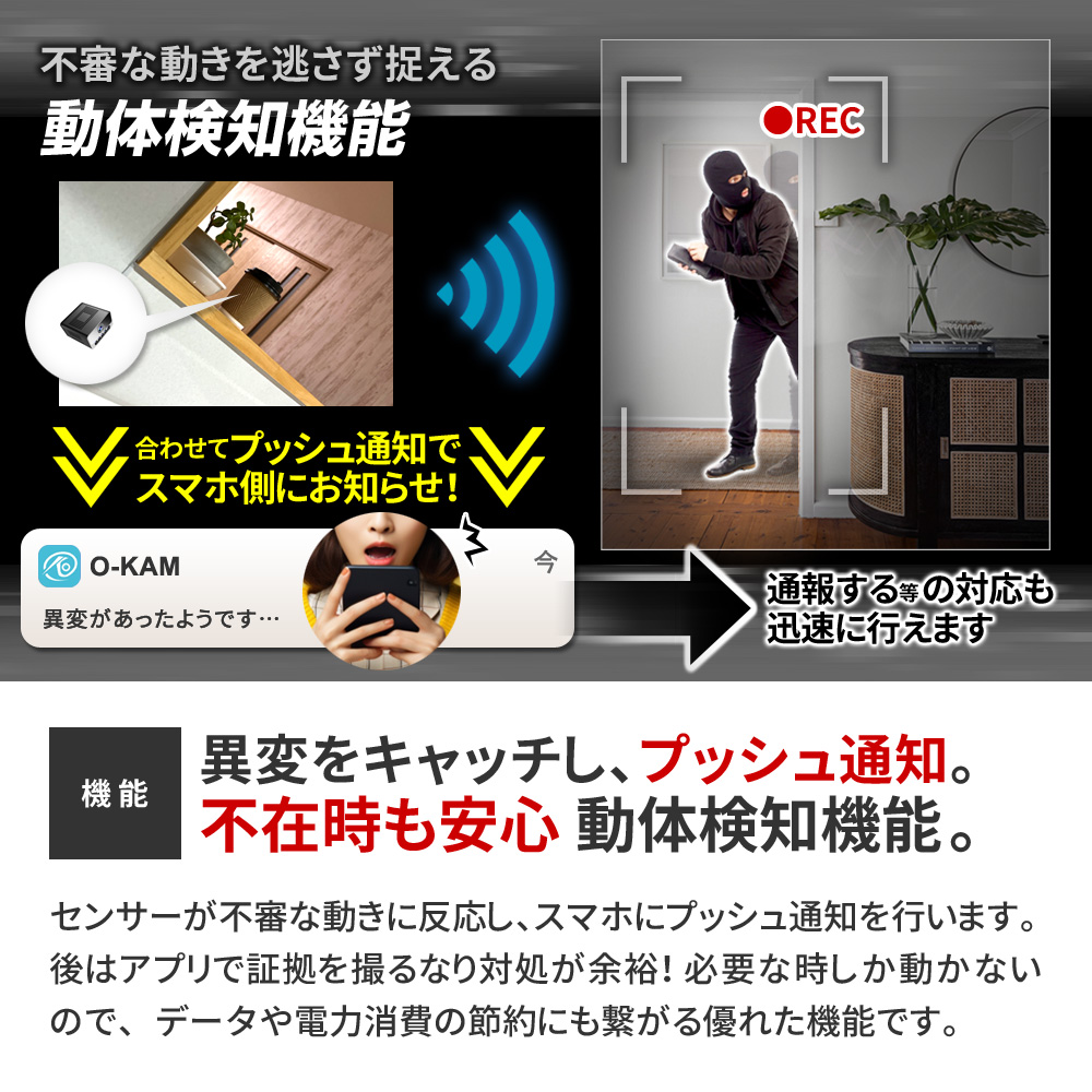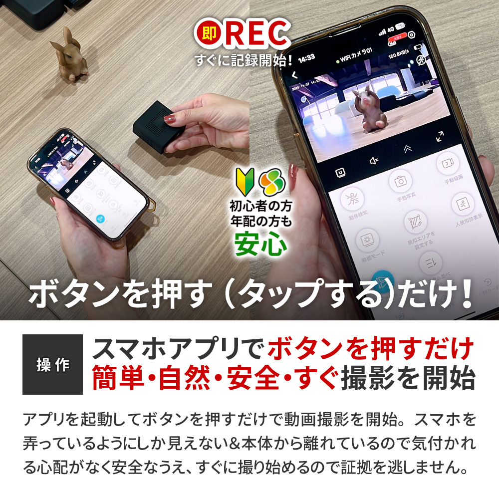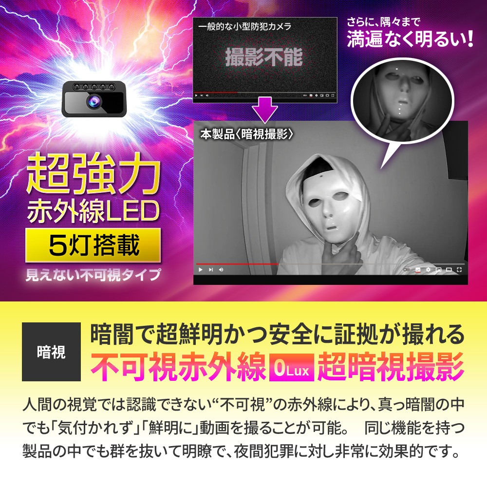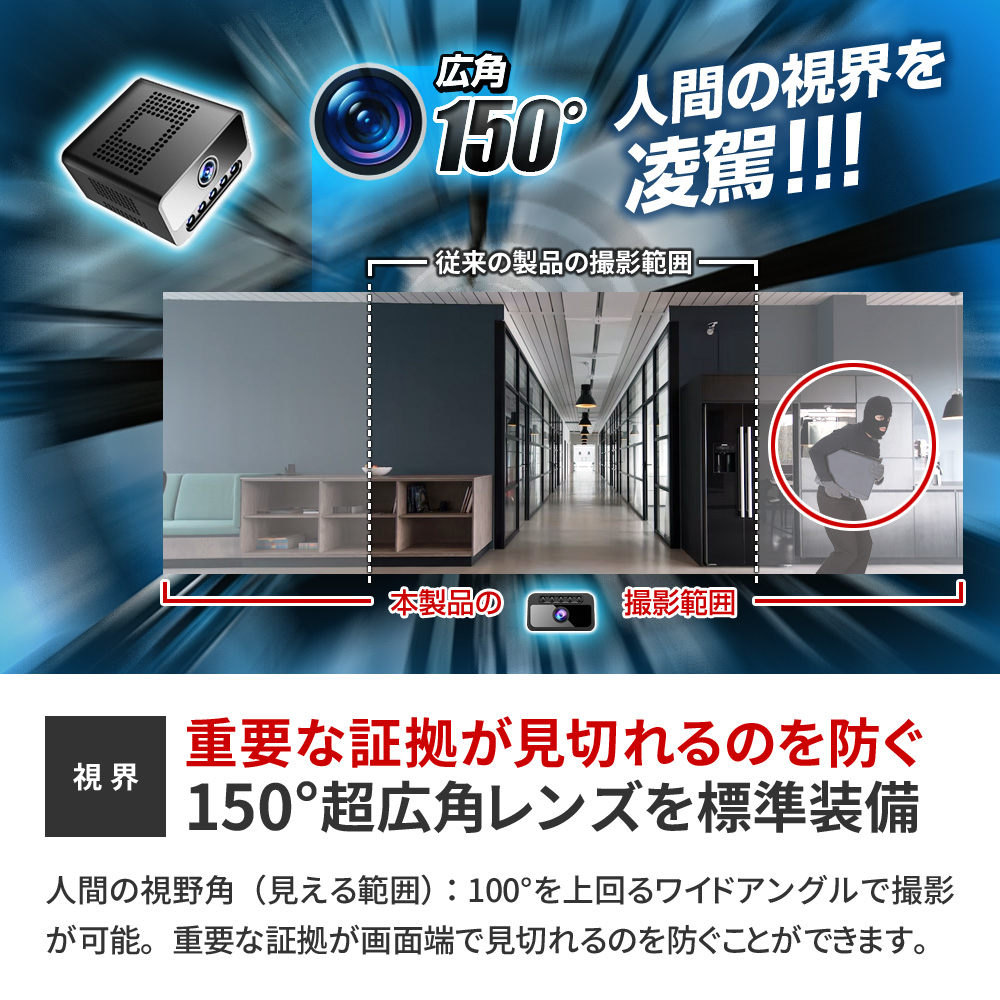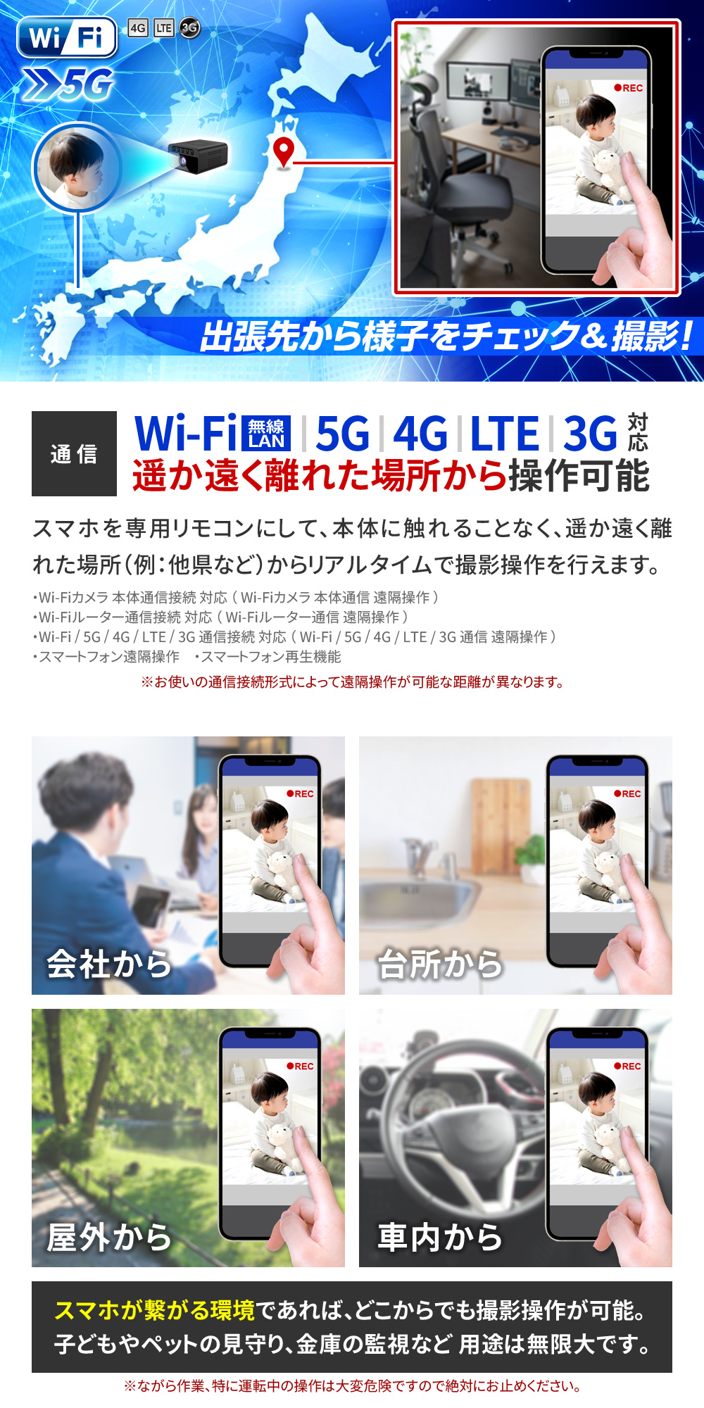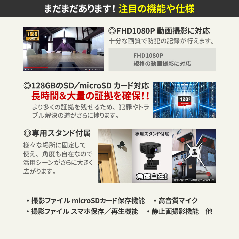 ・Wi-Fi カメラ本体通信 遠隔操作 ・Wi-Fi ルーター通信 遠隔操作 ・Wi-Fi 3G・4G・5G・LTE通信 遠隔操作 ・Wi-Fi高速接続 ・FHD1080P規格 動画撮影 ・広角150°レンズ ・H.264/MPEG-4 AVC コーデック ・不可視 赤外線LED 超暗視撮影機能 ・動体検知機能(プッシュ通知付き) ・繰り返し録画機能 ・外部電源 24時間連続録画機能 ・自動監視システム ・静止画撮影機能 ・microSDカード最大128GB対応 ・簡単設定機能 ・撮影ファイル スマホ保存機能 ・撮影ファイル スマホ再生機能 ・撮影ファイル microSDカード保存機能 ・詳細設定機能 ・簡単操作 ・専用スタンド |