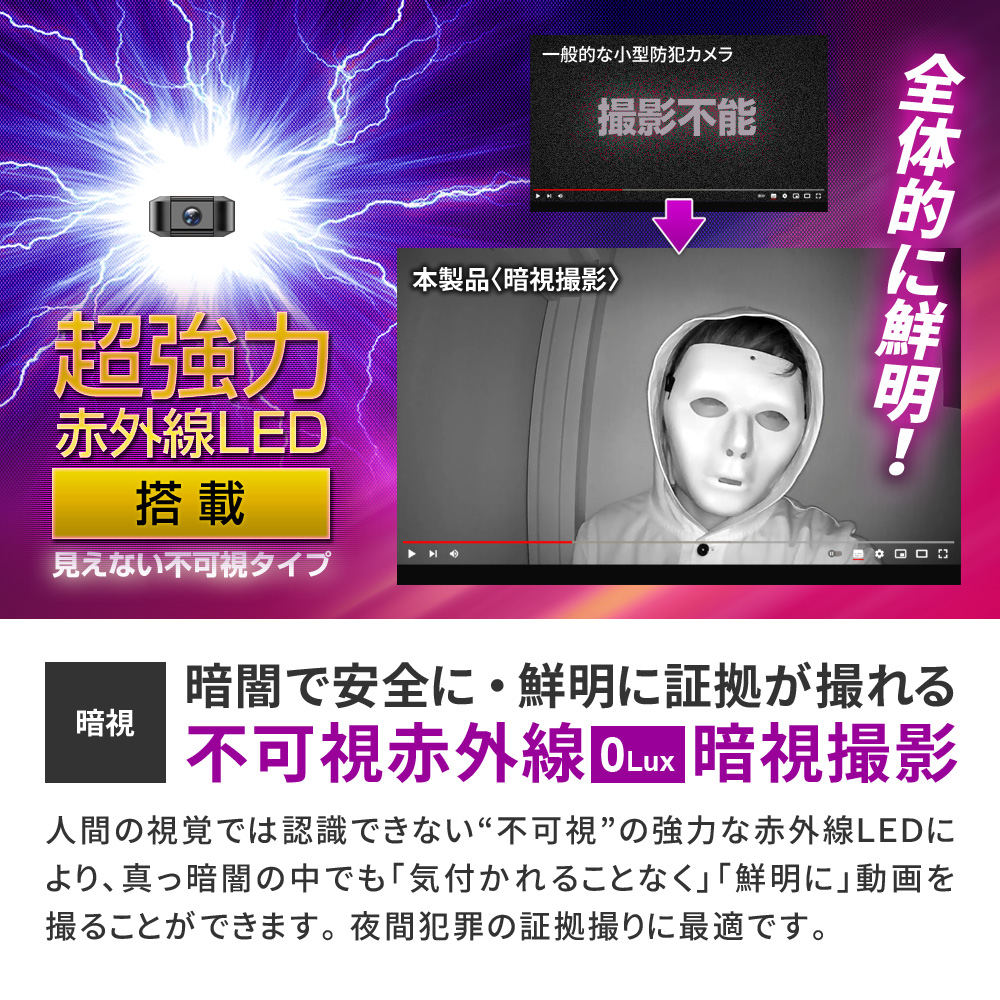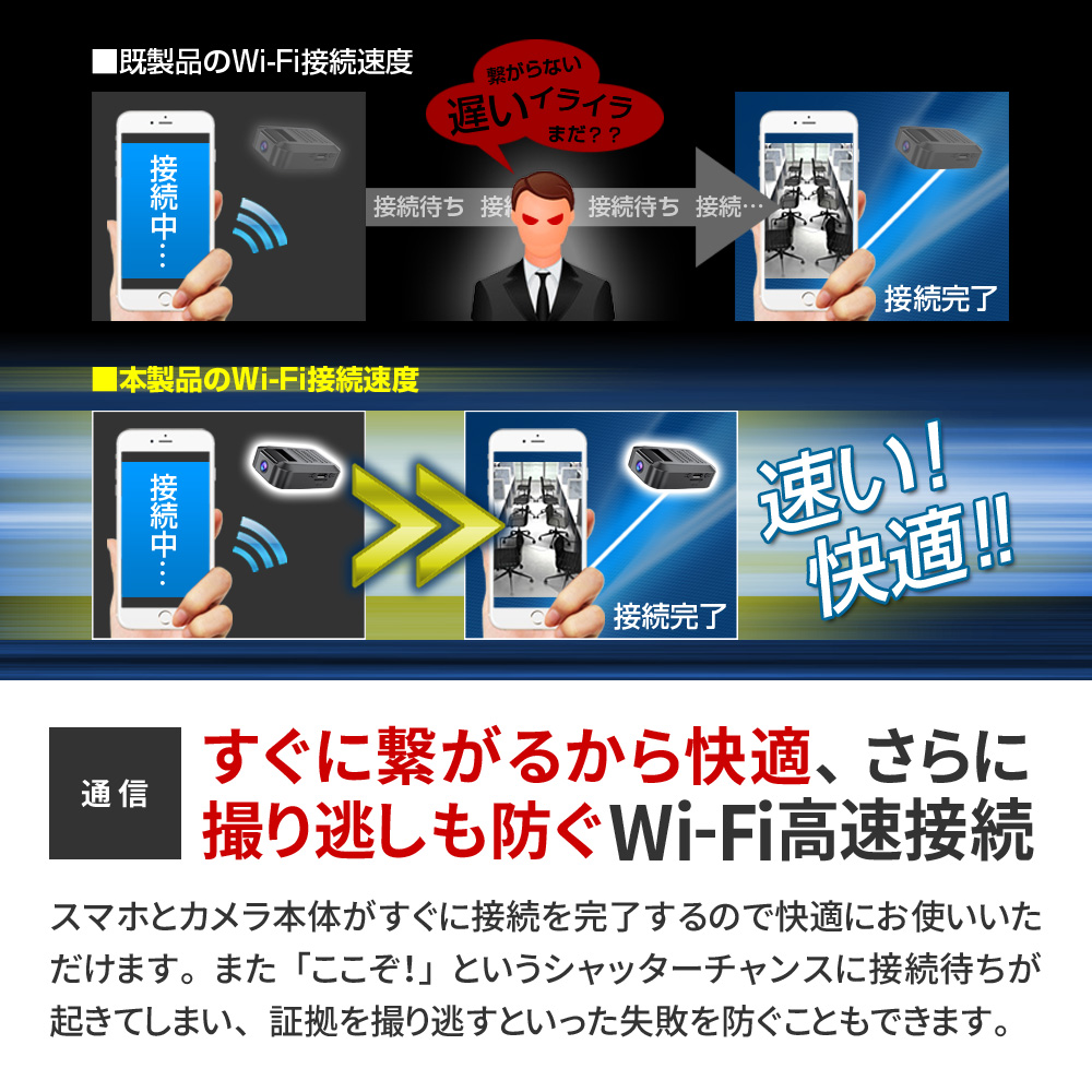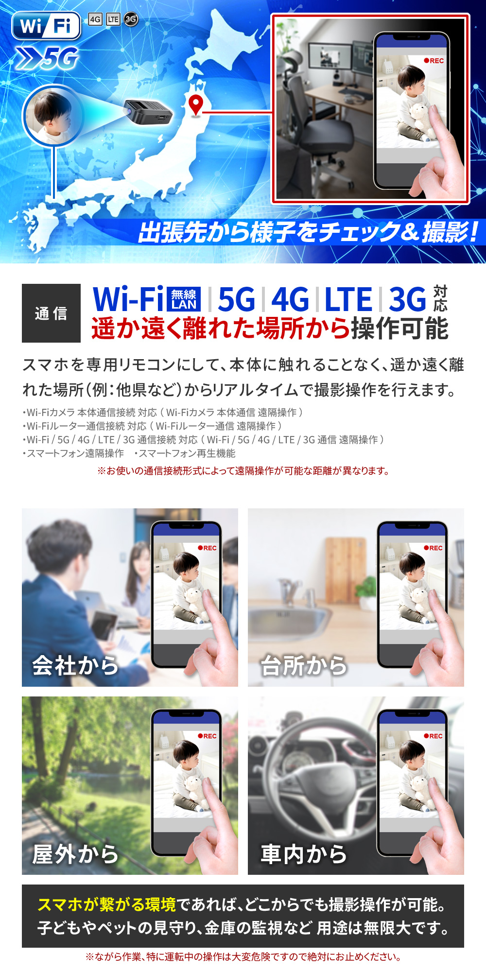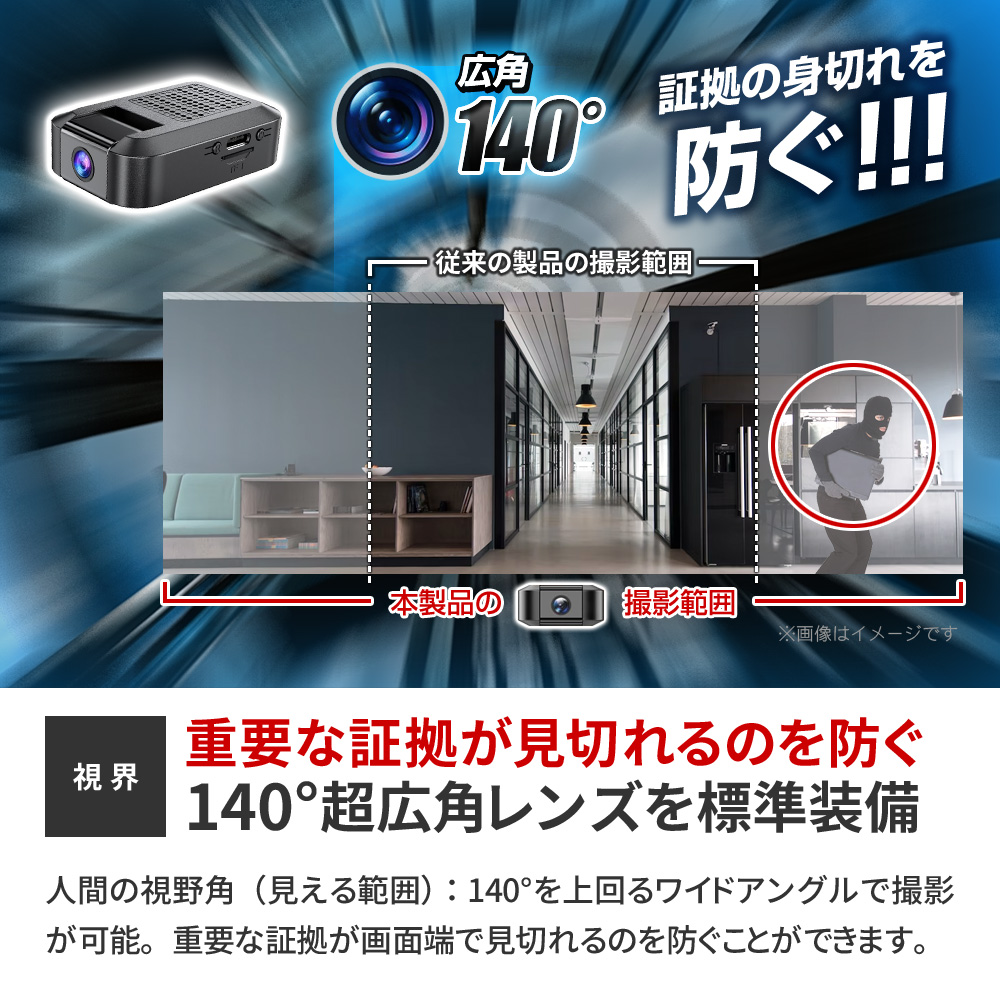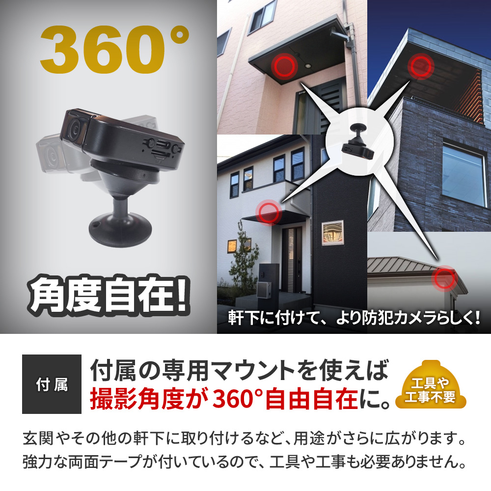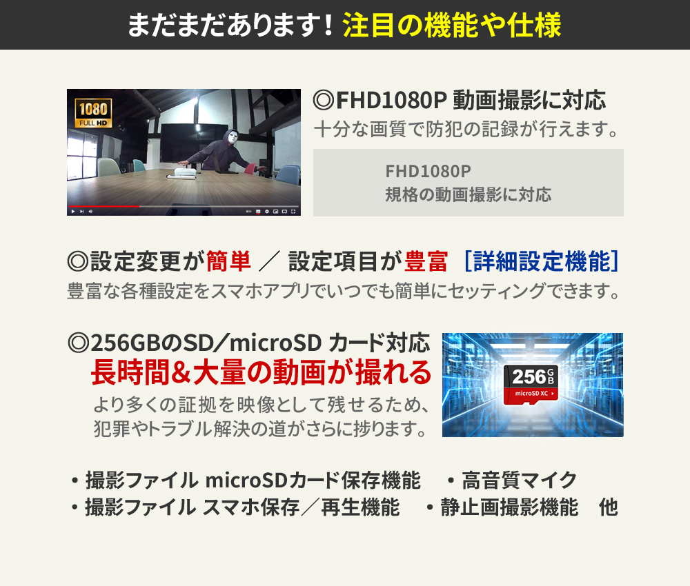 ・Wi-Fi カメラ本体通信 遠隔操作 ・Wi-Fi ルーター通信 遠隔操作 ・Wi-Fi 3G・4G・5G・LTE通信 遠隔操作 ・Wi-Fi高速接続 ・FHD1080P規格 動画撮影 ・静止画撮影機能 ・180°可変レンズ ・広角140°レンズ ・不可視 赤外線LED暗視撮影機能 ・動体検知機能(プッシュ通知付き) ・繰り返し録画機能 ・外部電源 24時間連続録画機能 ・自動監視システム ・microSDカード最大256GB対応 ・簡単設定機能 ・撮影ファイル スマホ保存機能 ・撮影ファイル スマホ再生機能 ・撮影ファイル microSDカード保存機能 ・詳細設定機能 ・簡単操作 ・専用マウント |