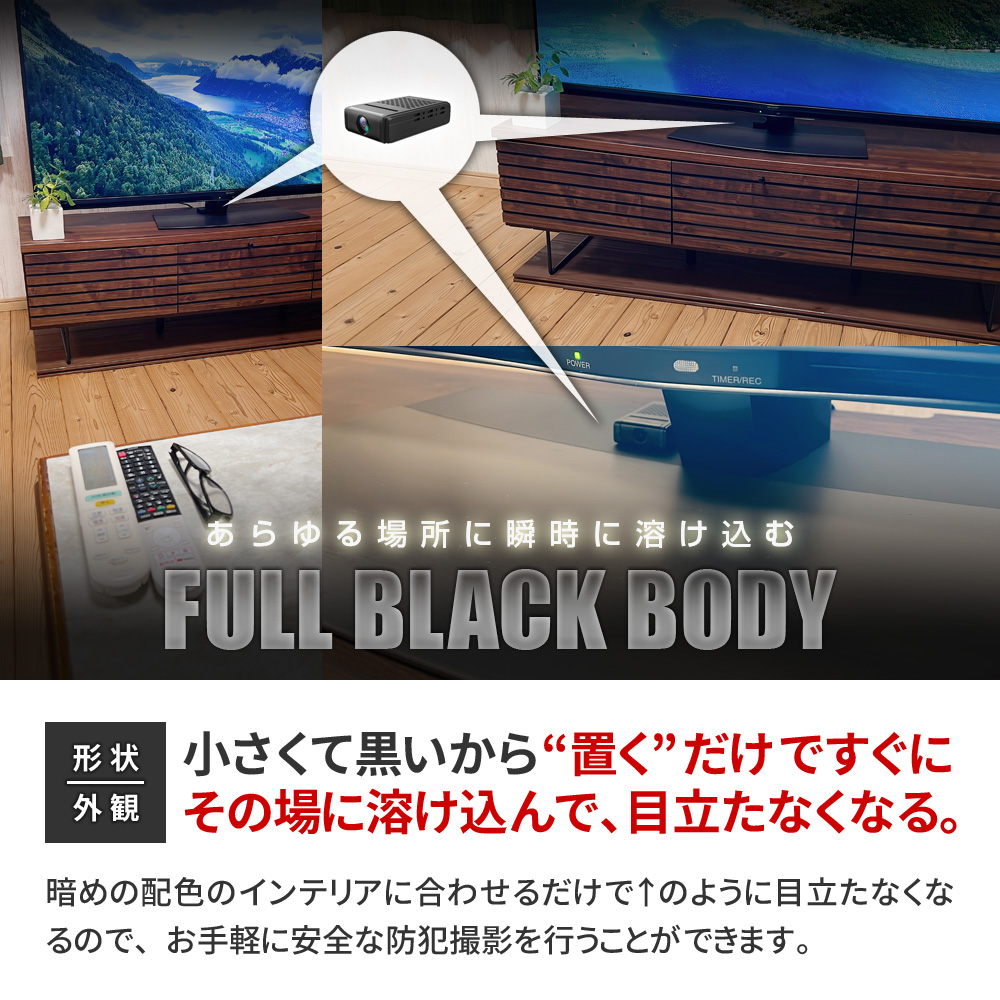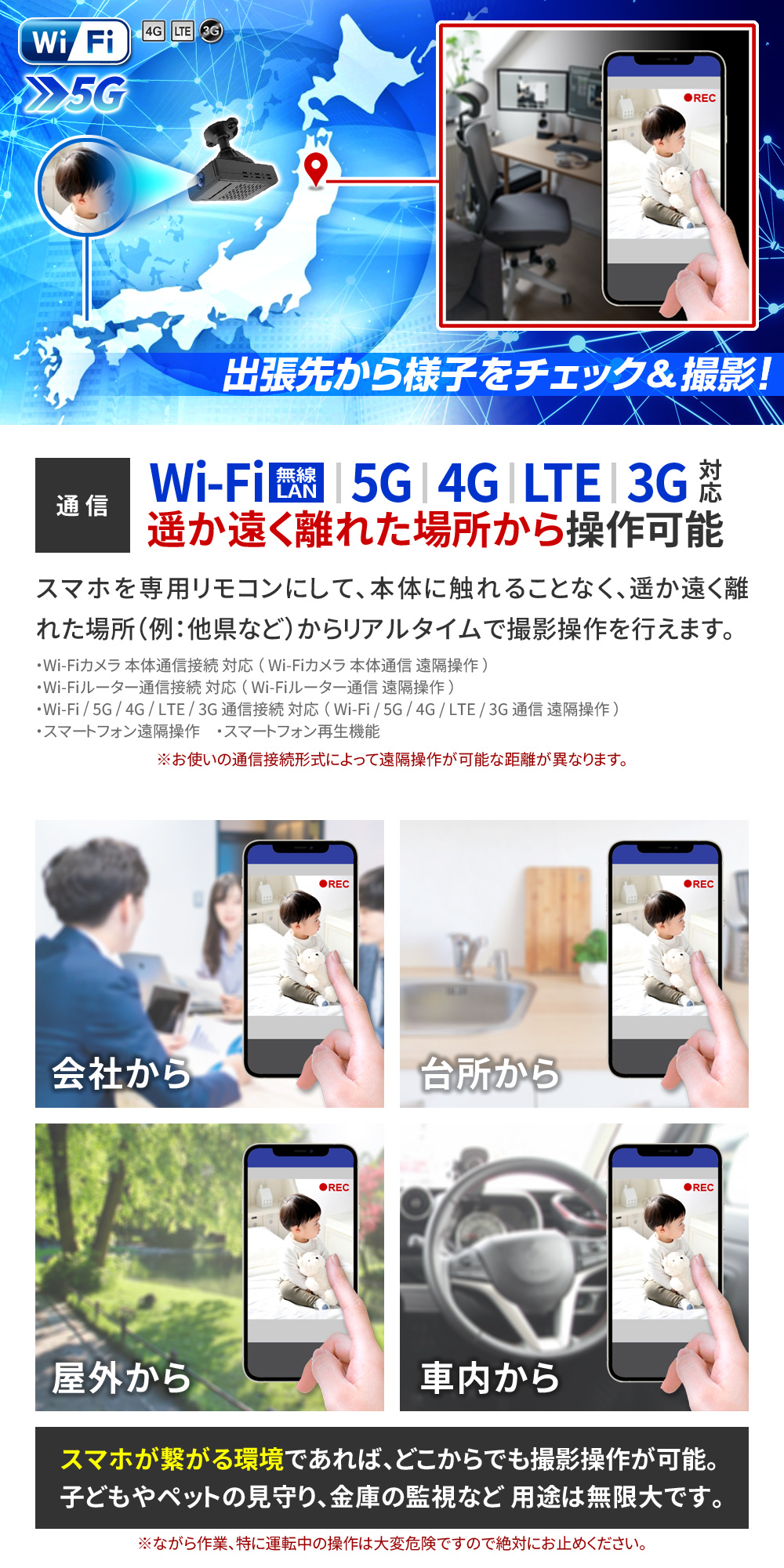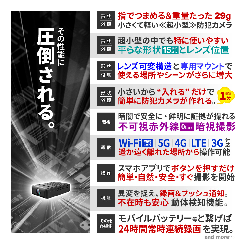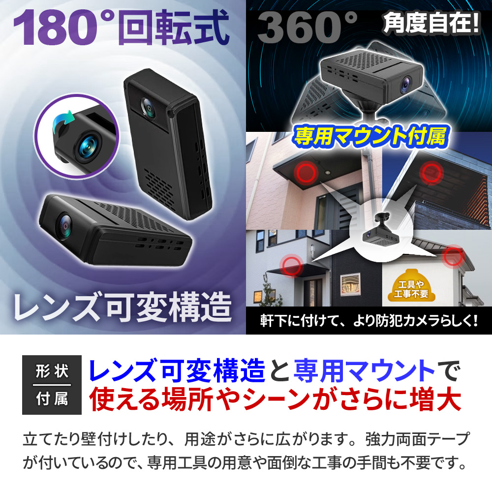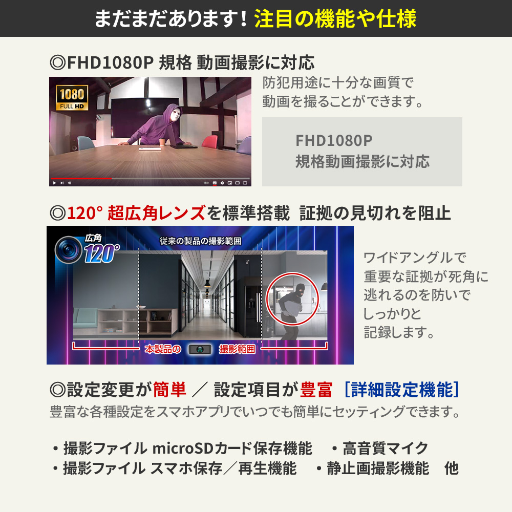 ・Wi-Fi カメラ本体通信 遠隔操作 ・Wi-Fi ルーター通信 遠隔操作 ・Wi-Fi 3G・4G・5G・LTE通信 遠隔操作 ・Wi-Fi高速接続 ・FHD1080P規格 動画撮影 ・静止画撮影機能 ・180°可変レンズ ・広角120°レンズ ・不可視 赤外線LED暗視撮影機能 ・動体検知機能(プッシュ通知付き) ・繰り返し録画機能 ・外部電源 24時間連続録画機能 ・自動監視システム ・microSDカード最大32GB対応 ・簡単設定機能 ・撮影ファイル スマホ保存機能 ・撮影ファイル スマホ再生機能 ・撮影ファイル microSDカード保存機能 ・詳細設定機能 ・簡単操作 ・専用マウント |