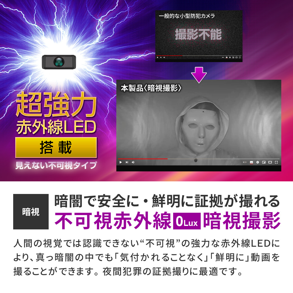 | 最低照度(赤外線照射時) | 0lux |