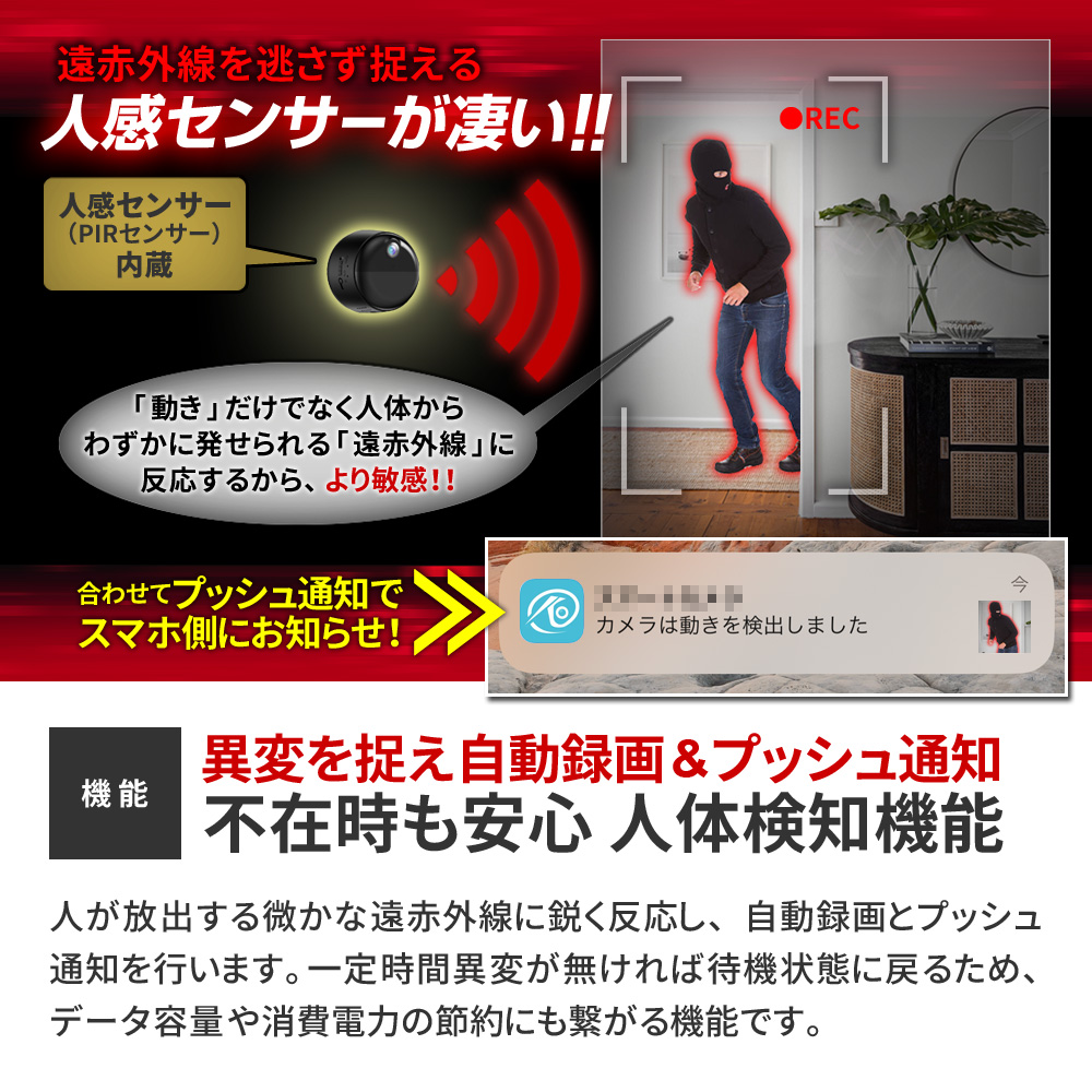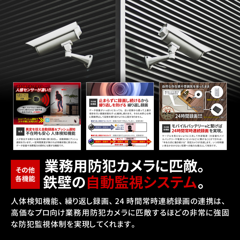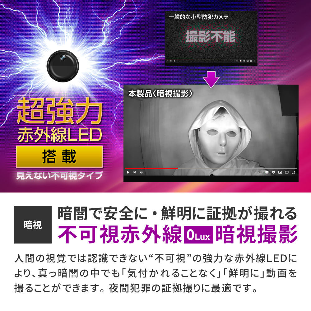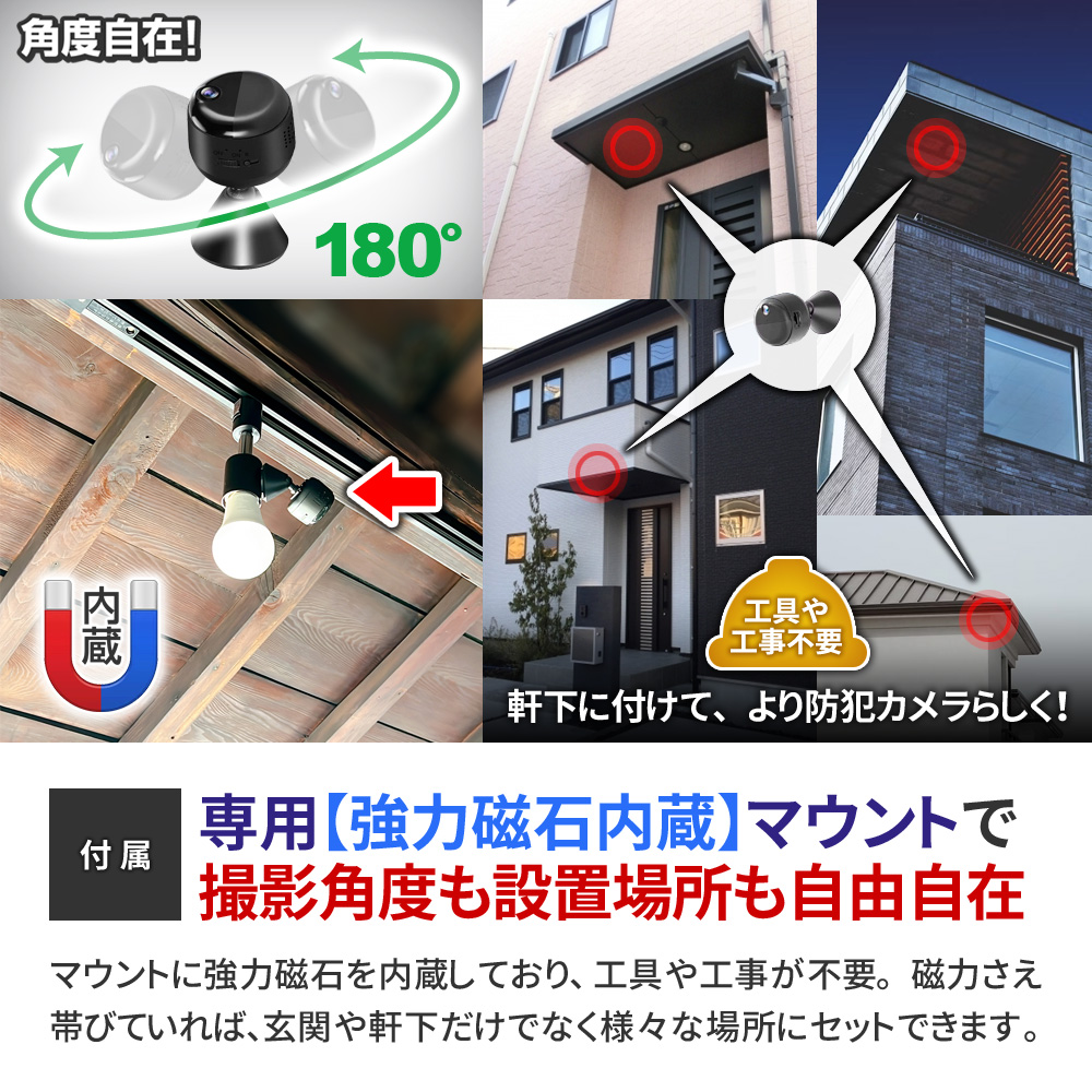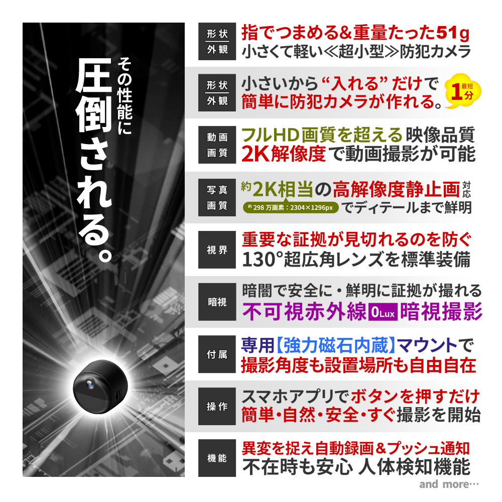 ・Wi-Fi ルーター通信 遠隔操作 ・Wi-Fi 3G/4G/5G/LTE通信 遠隔操作 ・Wi-Fi高速接続 ・広角130°レンズ ・H.264/MPEG-4 AVC コーデック ・2K規格 動画撮影 ・2K級 高画質静止画撮影 ・不可視 赤外線LED暗視撮影機能 ・PIRセンサー搭載 人体検知機能(プッシュ通知付) ・繰り返し録画機能 ・外部電源 24時間連続録画機能 ・自動監視システム ・本体単独長時間稼働 ・microSDカード最大256GB対応 ・簡単設定機能 ・撮影ファイル スマホ保存機能 ・撮影ファイル スマホ再生機能 ・撮影ファイル microSDカード保存機能 ・詳細設定機能 ・簡単操作 ・専用マウント【強力磁石内蔵】 |