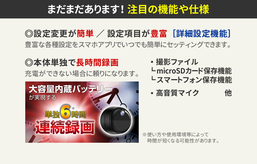 録画:約6時間 ※初期フル充電時のバッテリー性能の目安です。 ※お客様のご使用環境により変動いたします。 ※バッテリー稼働時間は理論値であり稼働時間を保証するものではありません。 |