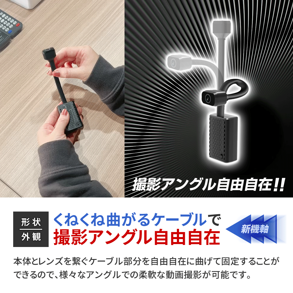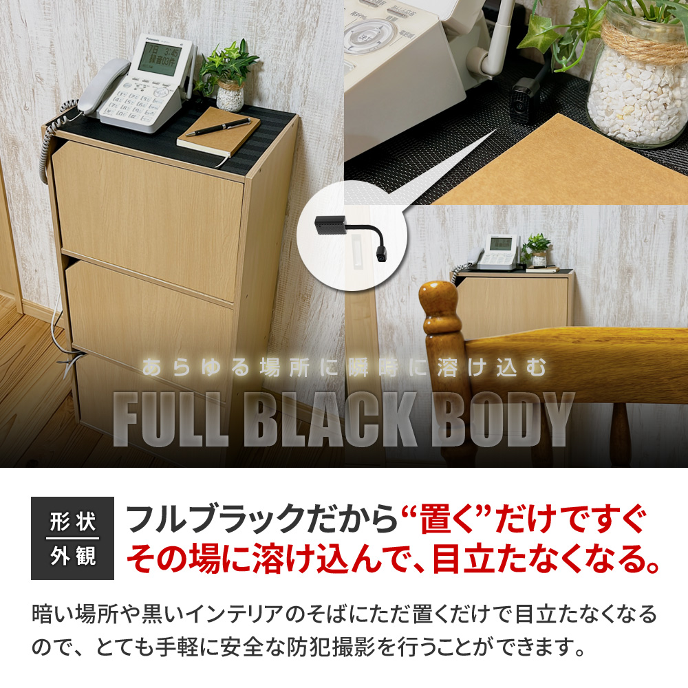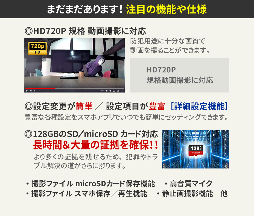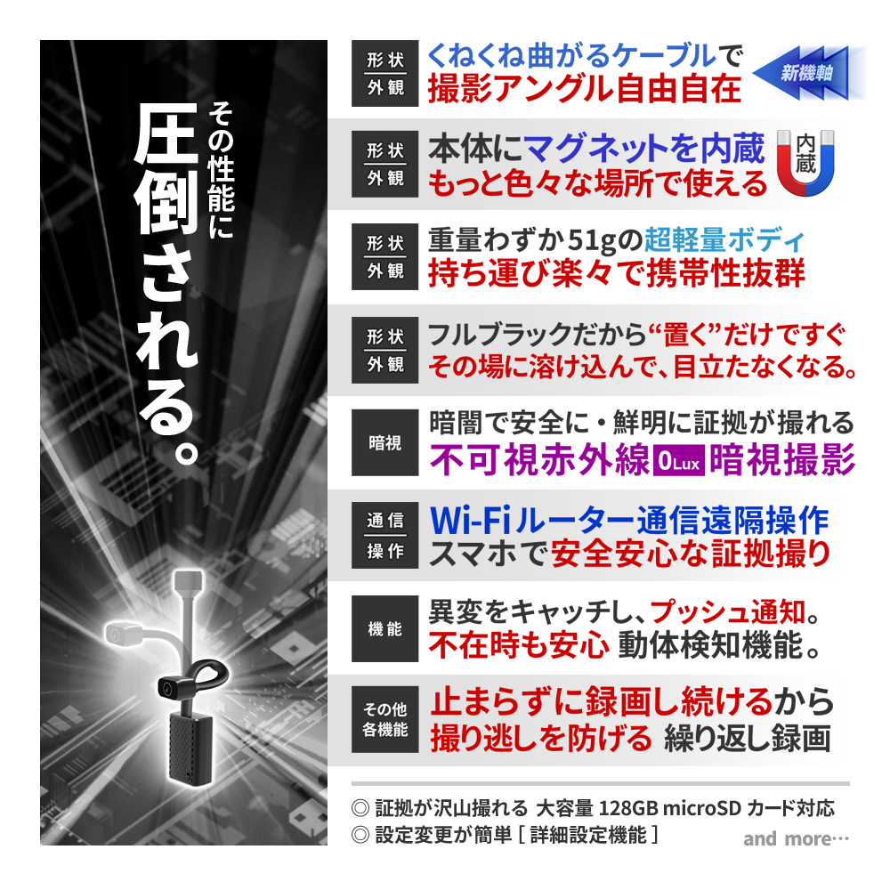 ・グースネックアーム(フレキシブルケーブル) ・本体に強力マグネット内蔵 ・HD720P規格 動画撮影 ・Wi-Fi ルーター通信 遠隔操作 ・H.264/MPEG-4 AVC コーデック ・フレームレート20FPS(最大) ・不可視 赤外線LED暗視撮影機能 ・静止画撮影機能 ・動体検知機能(プッシュ通知付き) ・繰り返し録画機能 ・microSDカード最大128GB対応 ・撮影ファイル スマホ保存機能 ・撮影ファイル スマホ再生機能 ・撮影ファイル microSDカード保存機能 ・詳細設定機能 ・簡単操作 |