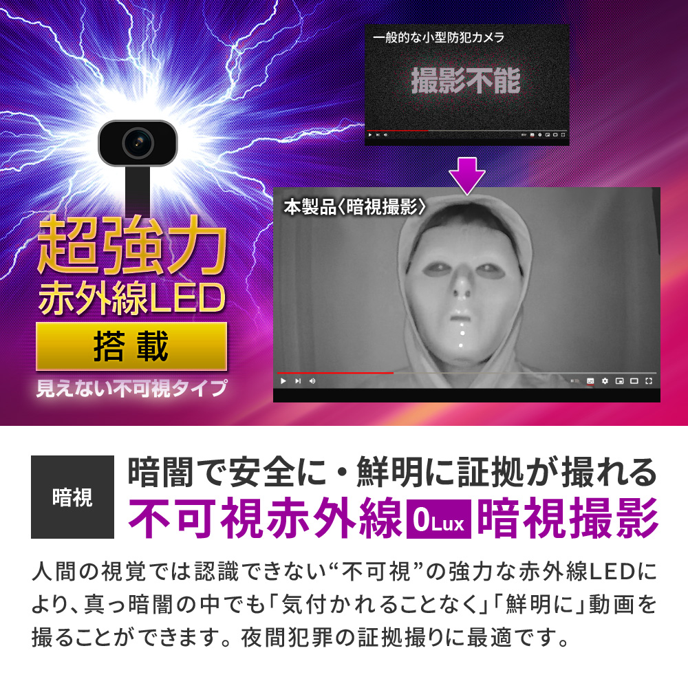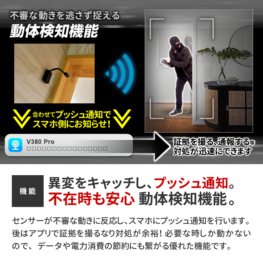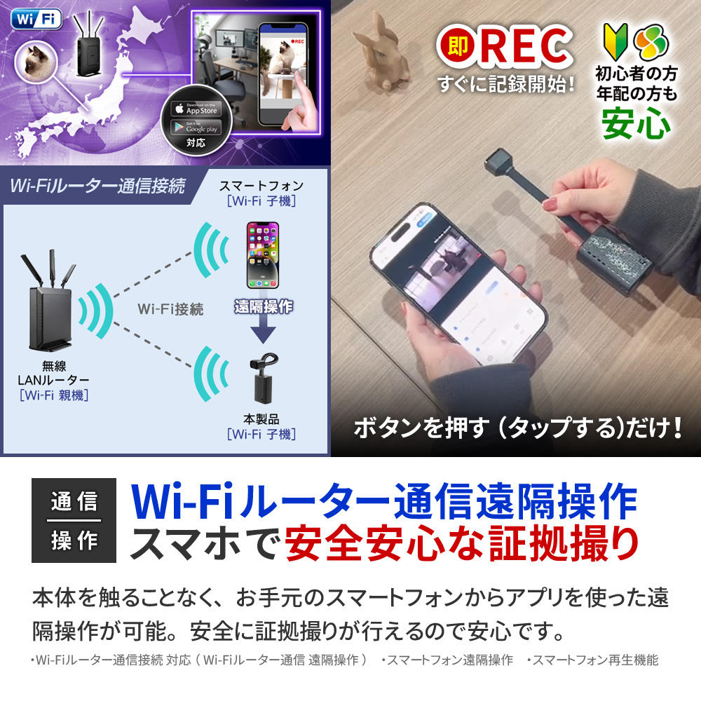 ・グースネックアーム(フレキシブルケーブル) ・本体に強力マグネット内蔵 ・HD720P規格 動画撮影 ・Wi-Fi ルーター通信 遠隔操作 ・H.264/MPEG-4 AVC コーデック ・フレームレート20FPS(最大) ・不可視 赤外線LED暗視撮影機能 ・静止画撮影機能 ・動体検知機能(プッシュ通知付き) ・繰り返し録画機能 ・microSDカード最大128GB対応 ・撮影ファイル スマホ保存機能 ・撮影ファイル スマホ再生機能 ・撮影ファイル microSDカード保存機能 ・詳細設定機能 ・簡単操作 |