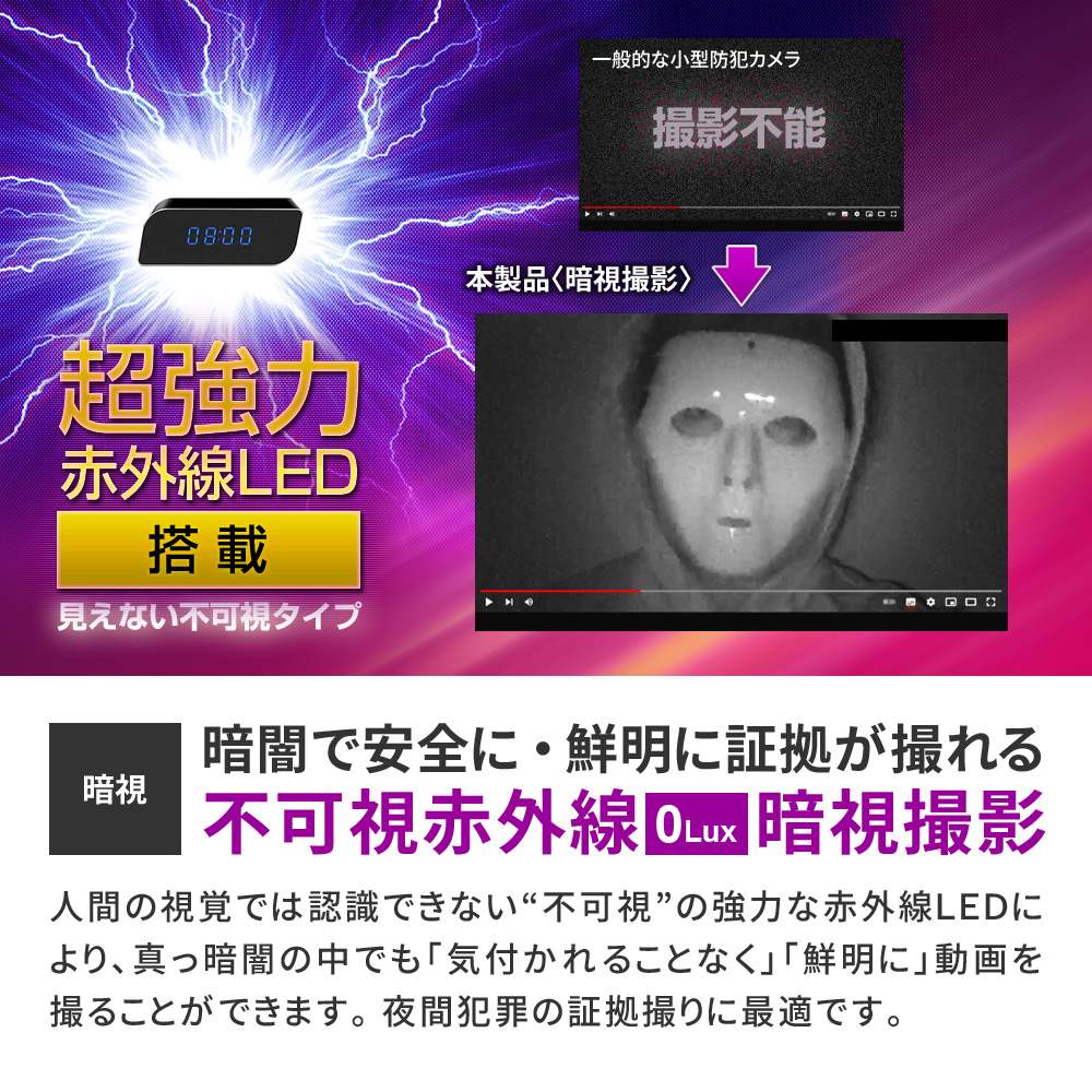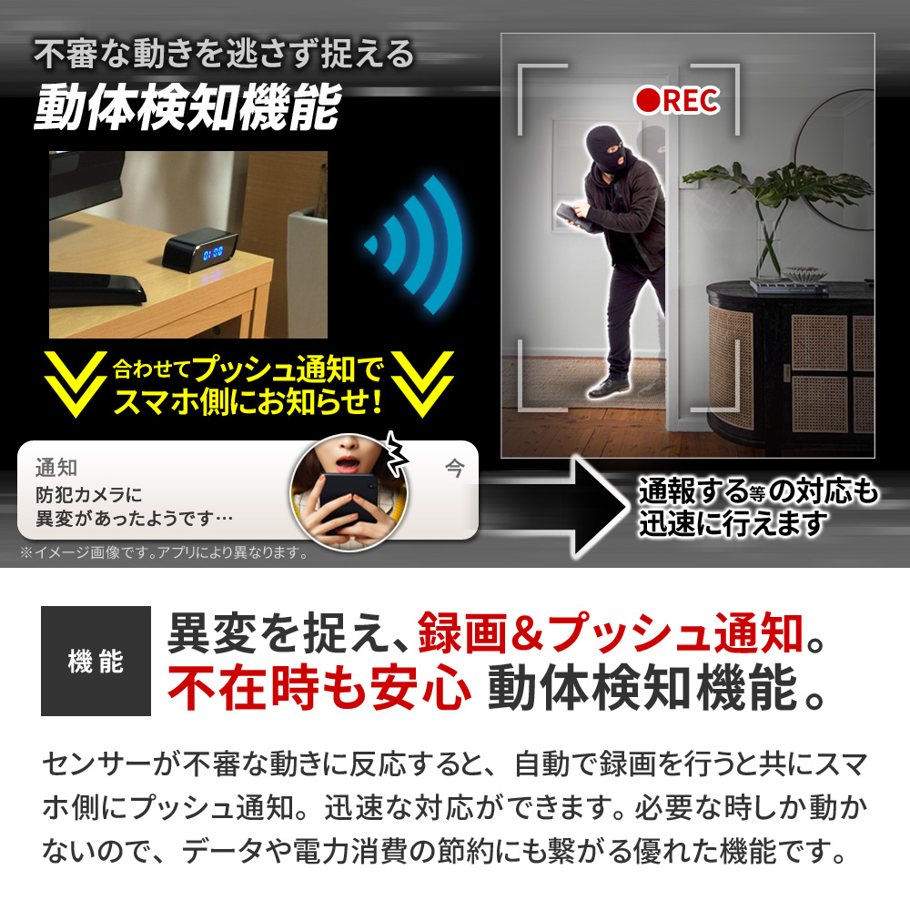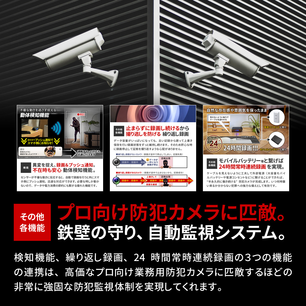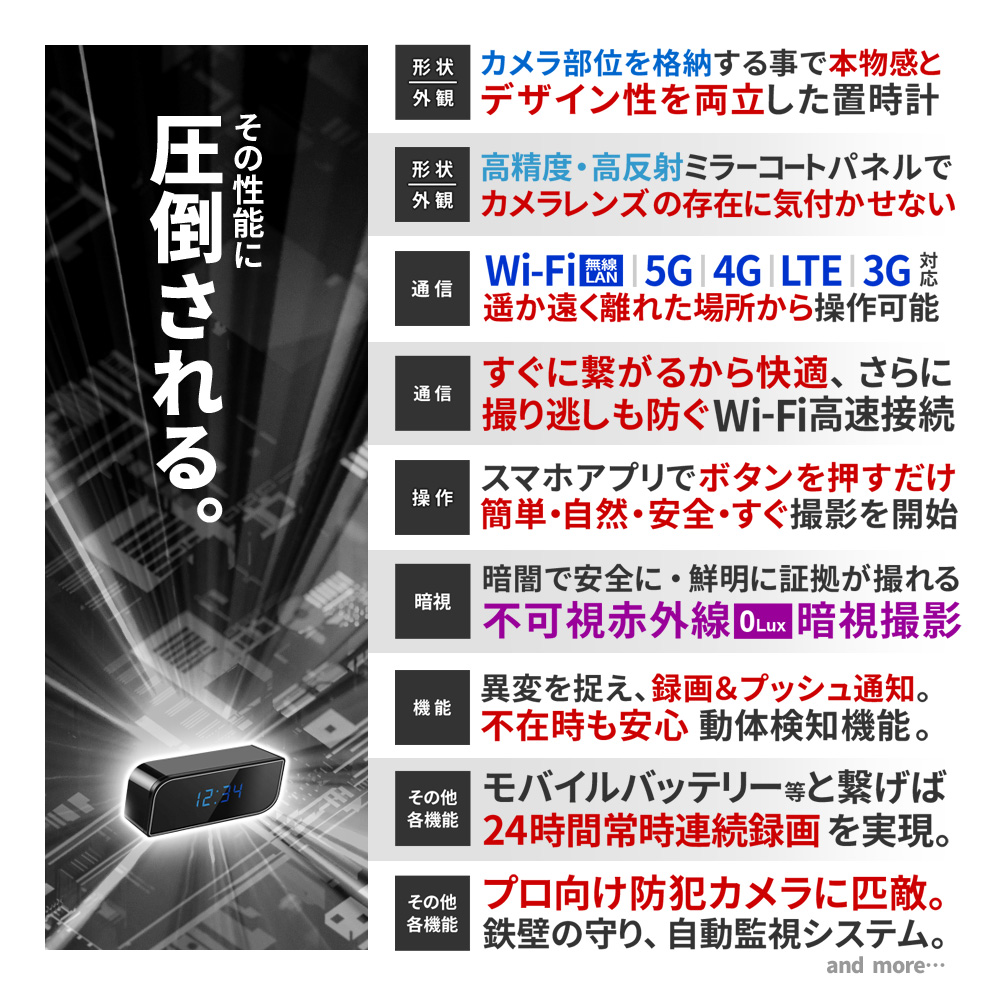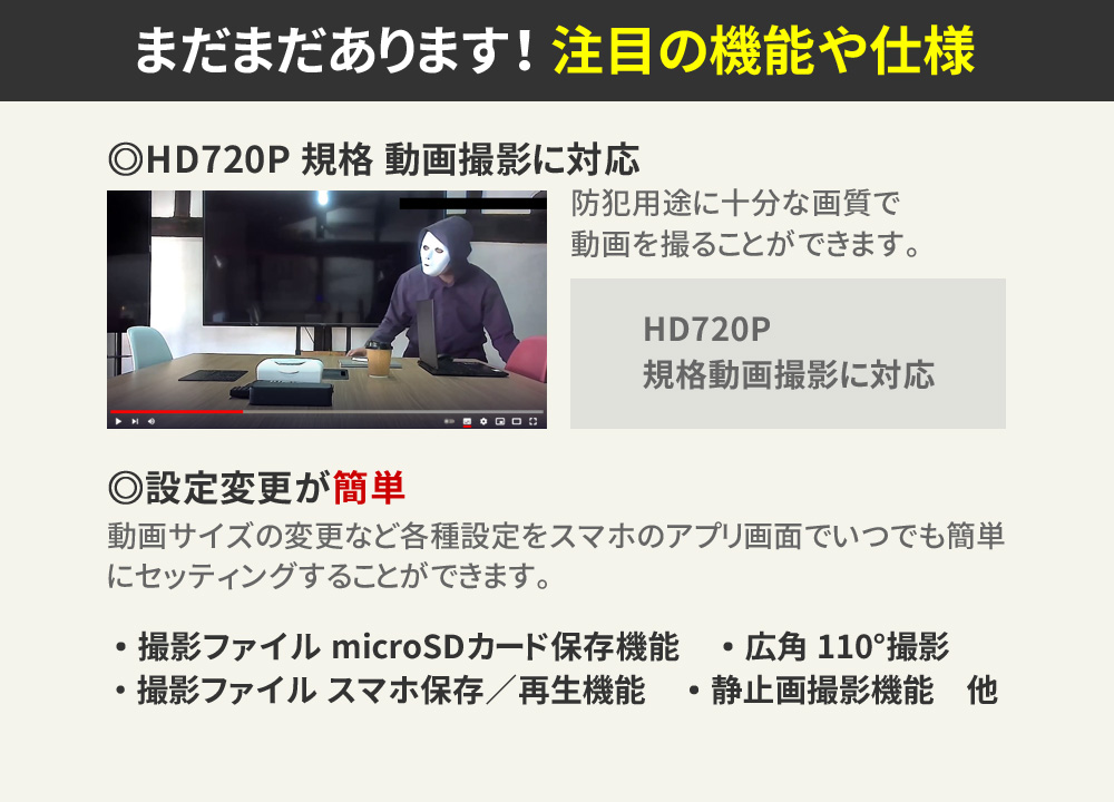 ・Wi-Fi ルーター通信 遠隔操作 ・Wi-Fi 3G・4G・5G・LTE通信 遠隔操作 ・H.264/MPEG-4 AVC コーデック ・HD720P規格 動画撮影 ・広角110°レンズ ・不可視 赤外線LED暗視撮影機能 ・動体検知機能(プッシュ通知付き) ・繰り返し録画機能 ・外部電源 24時間連続録画機能 ・自動監視システム ・microSDカード最大256GB対応 ・静止画撮影機能 ・高音質マイク ・詳細設定機能 ・撮影ファイル スマホ保存機能 ・撮影ファイル スマホ再生機能 ・撮影ファイル microSDカード保存機能 ・簡単操作 |