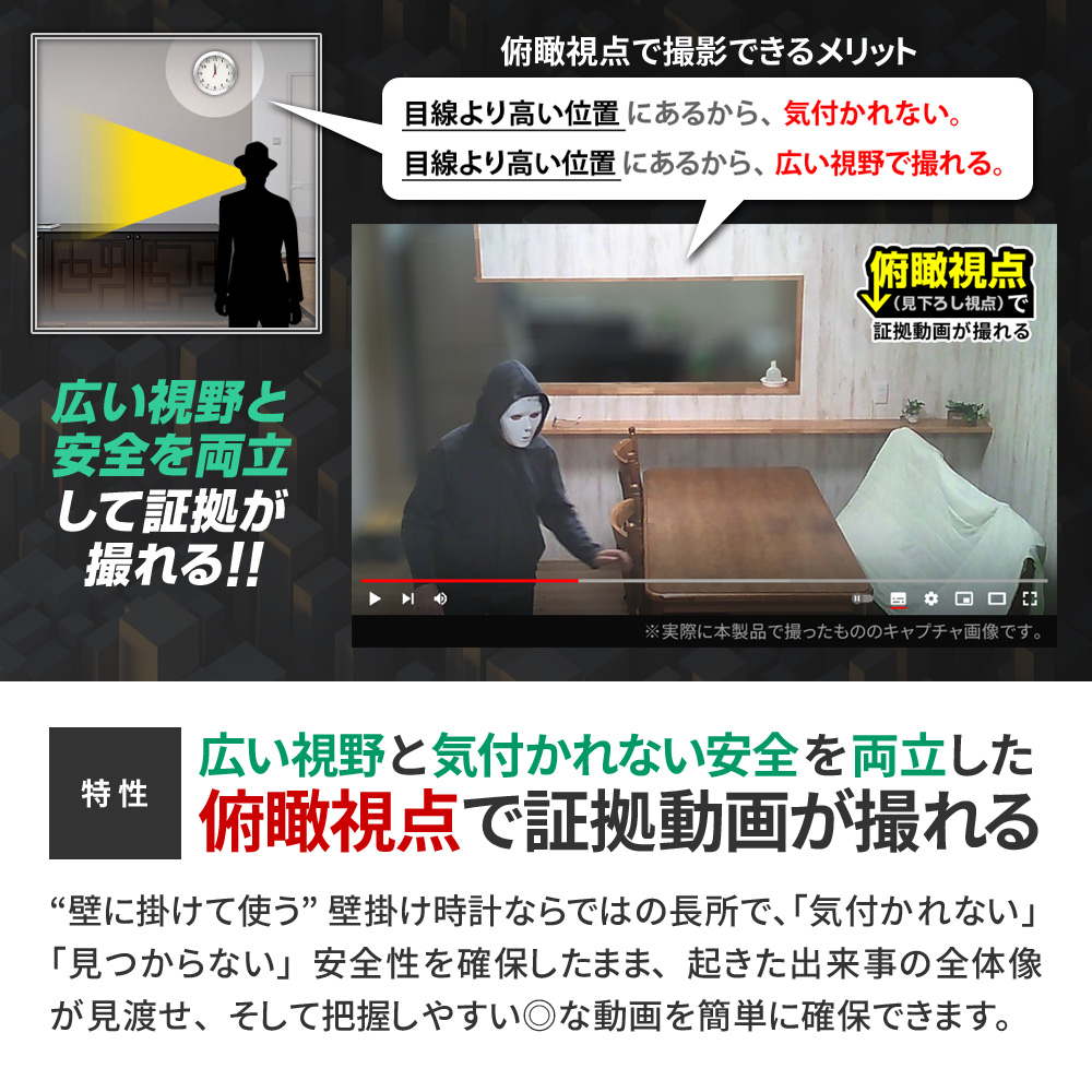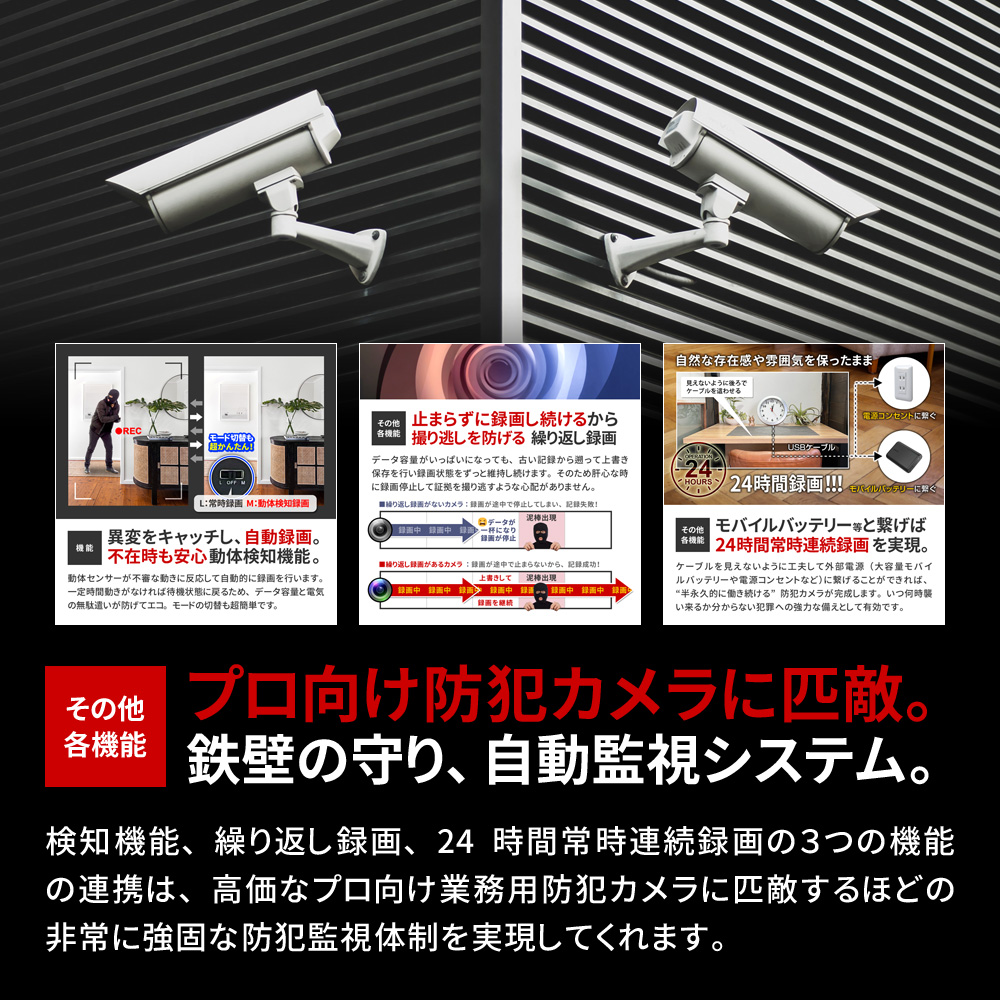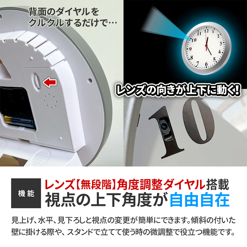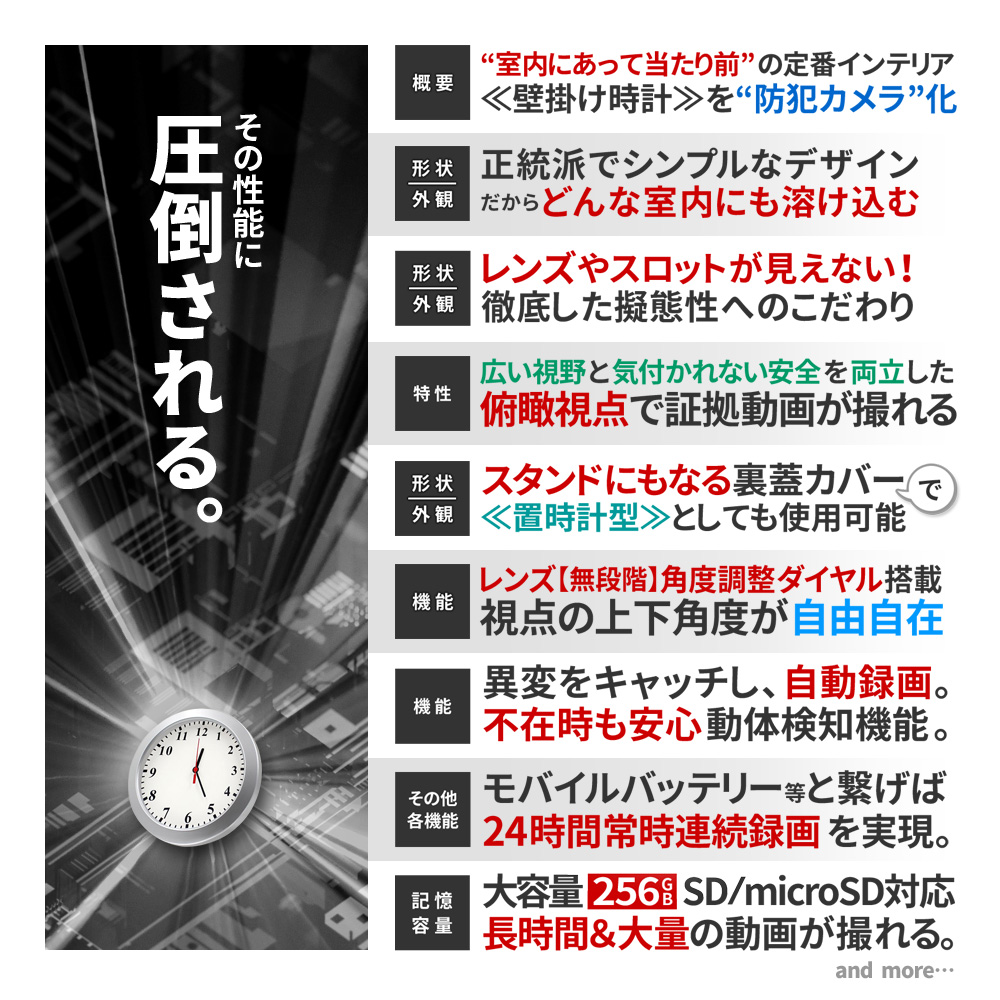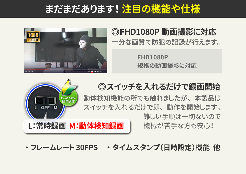・FHD1080P規格 動画撮影 ・Motion JPEG コーデック ・AVI動画ファイル ・フレームレート30FPS(最大) ・俯瞰視点撮影 ・レンズ無段階角度調整機能(背面ダイヤル式) ・可変式裏蓋カバースタンド ・本体単独長時間録画 ・動体検知録画機能(切替簡単) ・繰り返し録画機能 ・外部電源 24時間連続録画機能 ・自動監視システム ・microSDカード最大256GB対応 ・タイムスタンプ(日時設定)機能 ・簡単操作 |