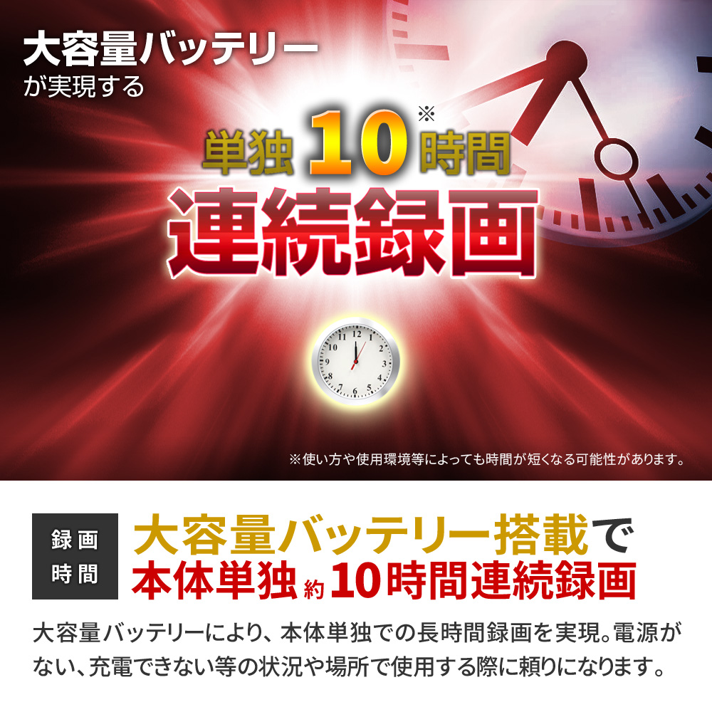 録画:約10時間 ※初期フル充電時のバッテリー性能の目安です。 ※お客様のご使用環境により変動いたします。 ※バッテリー稼働時間は理論値であり稼働時間を保証するものではありません。 |