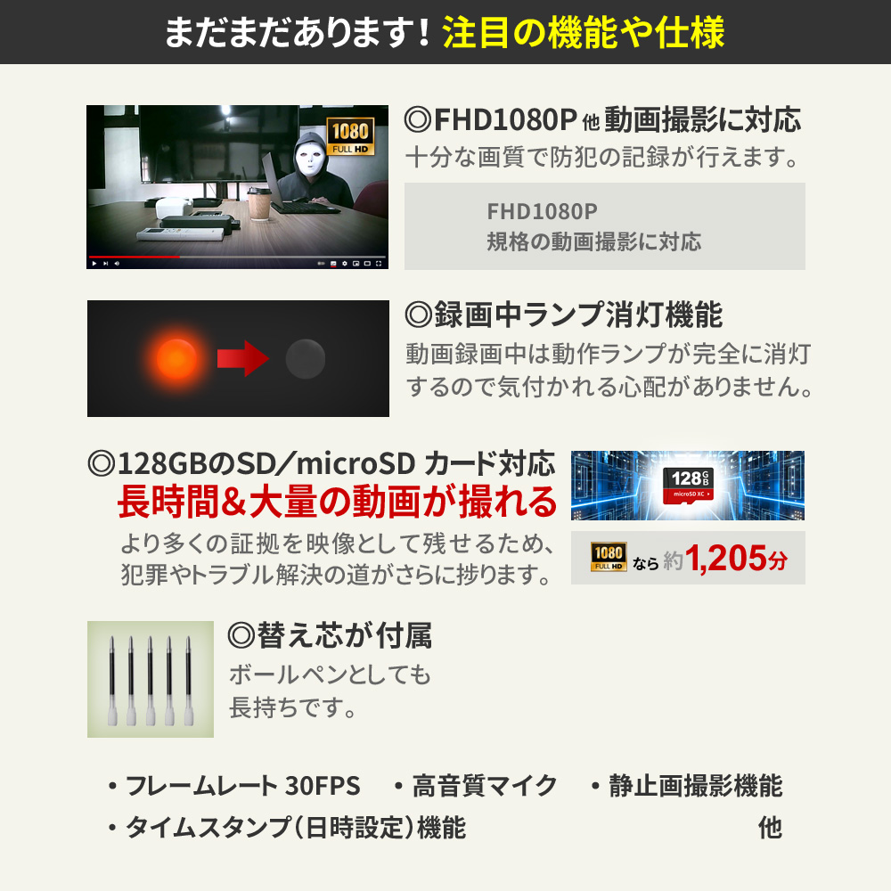 ・レンズミラーコート仕様 ・FHD1080P規格 動画撮影 ・Motion JPEG コーデック ・AVI動画ファイル ・フレームレート30FPS(最大) ・静止画撮影機能 ・高音質マイク ・外部電源 24時間連続録画機能 ・繰り返し録画機能 ・microSDカード最大128GB対応 ・タイムスタンプ(日時設定)機能 ・録画中ランプ消灯機能 ・簡単操作 ・替え芯付属 |