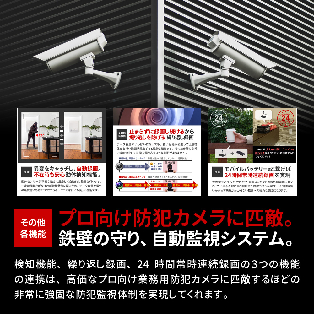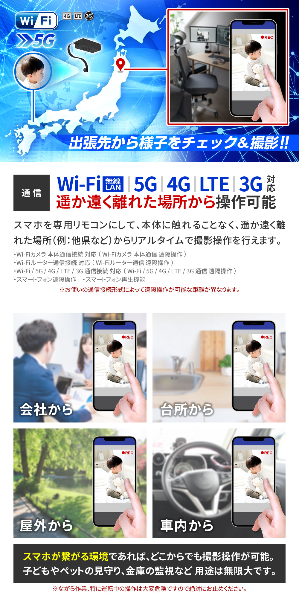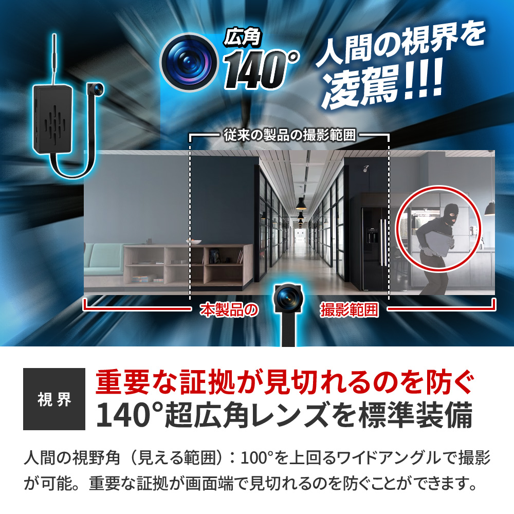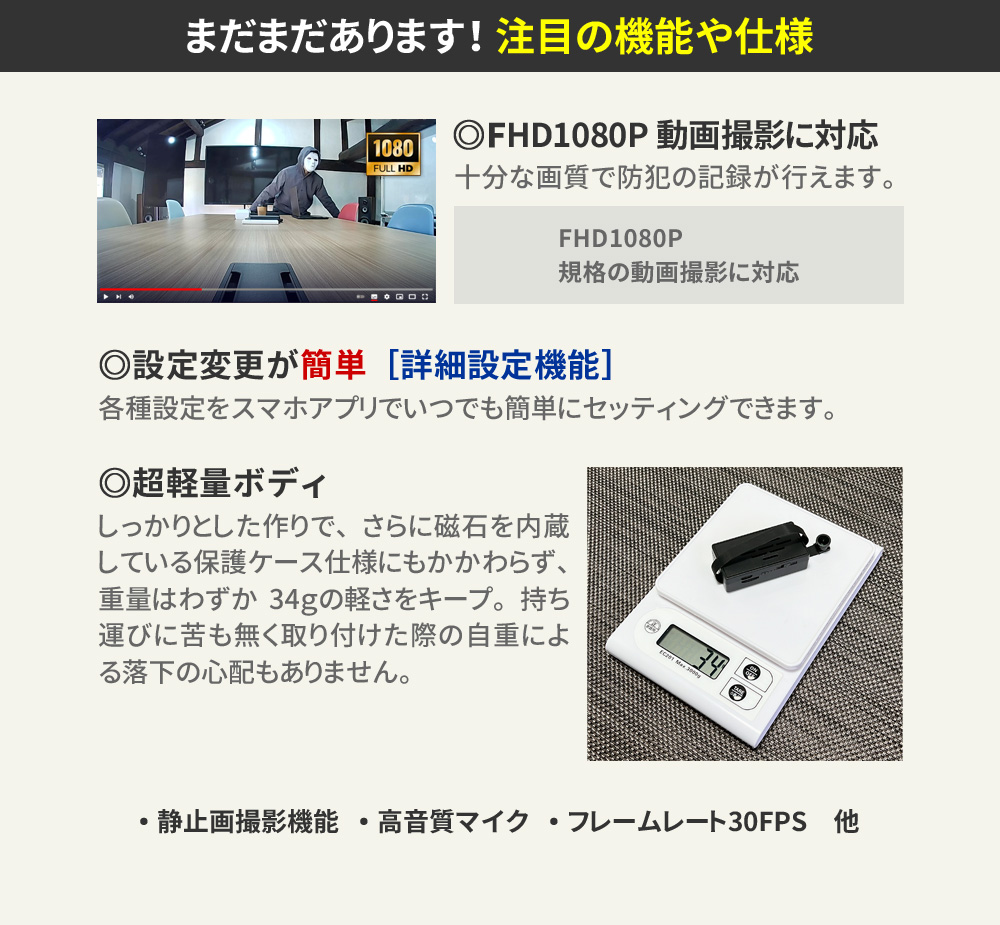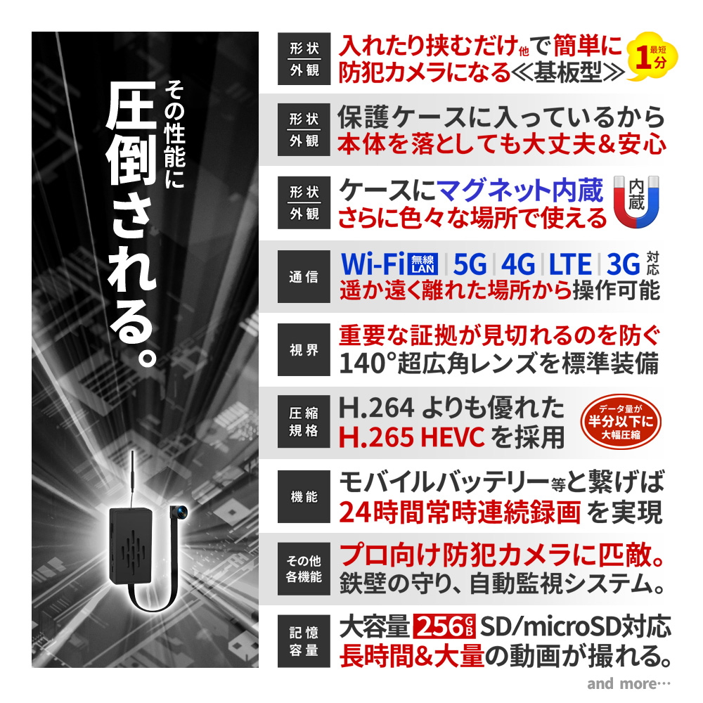 ・H.265 | MPEG-H HEVC コーデック ・FHD1080P規格 動画撮影 ・広角140°レンズ ・Wi-Fi ルーター通信 遠隔操作 ・Wi-Fi 3G・4G・5G・LTE通信 遠隔操作 ・動体検知録画機能 ・繰り返し録画機能 ・外部電源 24時間連続録画機能 ・自動監視システム ・microSDカード最大256GB対応 ・高音質マイク ・詳細設定機能 ・撮影ファイル スマホ保存機能 ・撮影ファイル スマホ再生機能 ・撮影ファイル microSDカード保存機能 ・静止画撮影機能 ・簡単操作 ・強力マグネット内蔵 |
