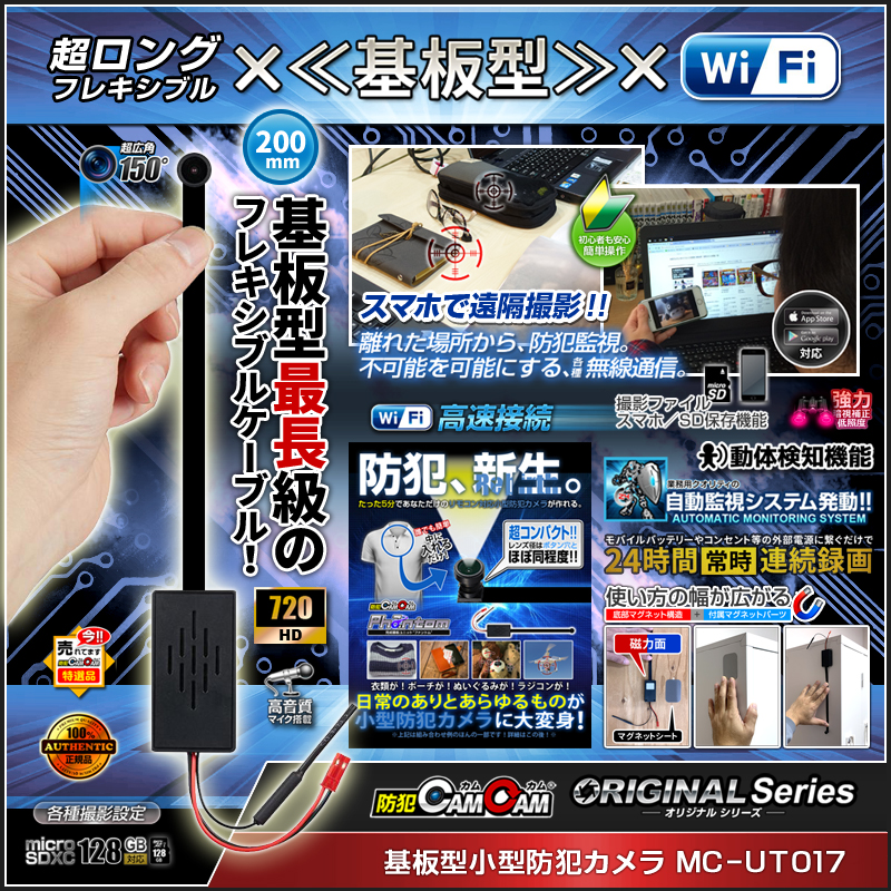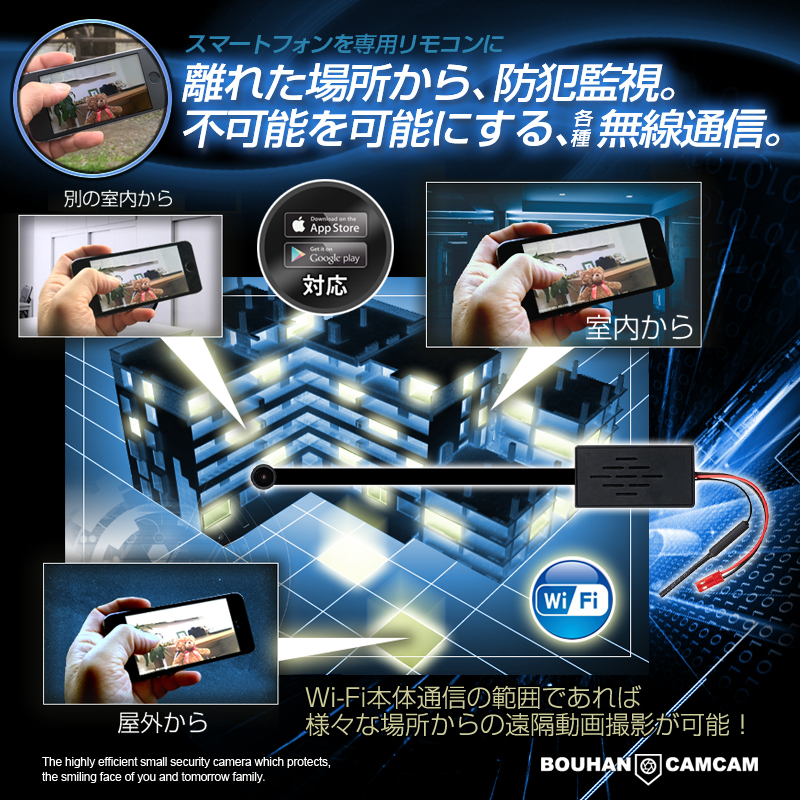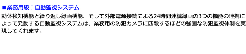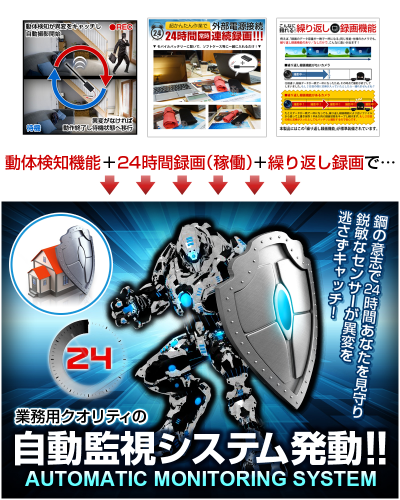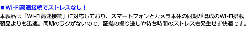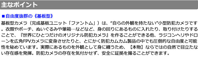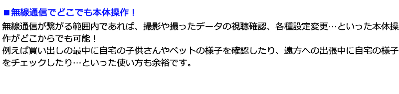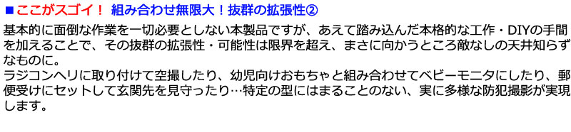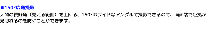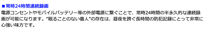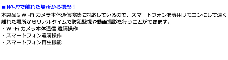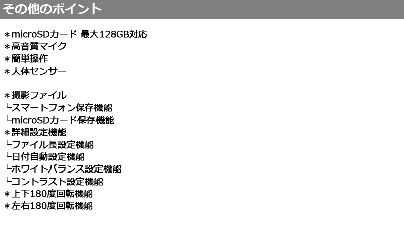 ・Wi-Fi カメラ本体通信 遠隔操作 ・Wi-Fi ルーター通信 遠隔操作 ・Wi-Fi 3G 4G LTE通信 遠隔操作 ・スマートフォン遠隔操作 ・スマートフォン再生機能 ・HD720P規格 動画撮影 ・H.264 | MPEG-4 AVC High Profile コーデック ・AVI動画ファイル ・フレームレート25FPS(最大) ・広角150°レンズ ・静止画撮影 ・暗視補正機能 ・繰返し録画機能 ・動体検知録画機能 ・外部電源 24時間連続録画機能 ・ファイル「超」高速転送 ・microSDカード最大128GB対応 ・撮影ファイル スマートフォン保存機能 ・撮影ファイル microSDカード保存機能 ・高音質マイク ・簡単操作 ・詳細設定機能 └日付自動設定機能 └コントラスト設定機能 └明るさ設定機能 └マイク音量設定機能 └ビデオ撮影ファイル時間設定 |