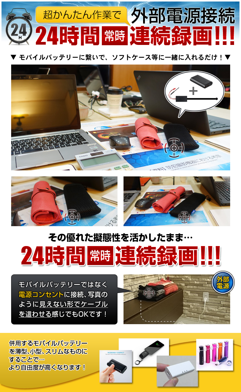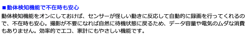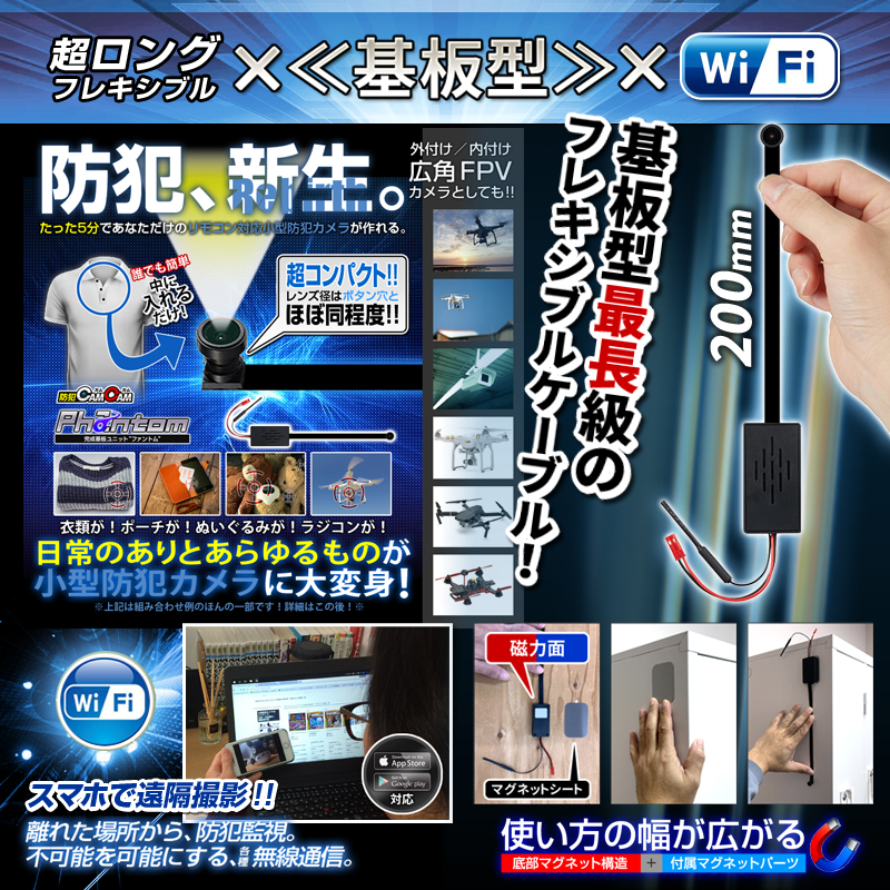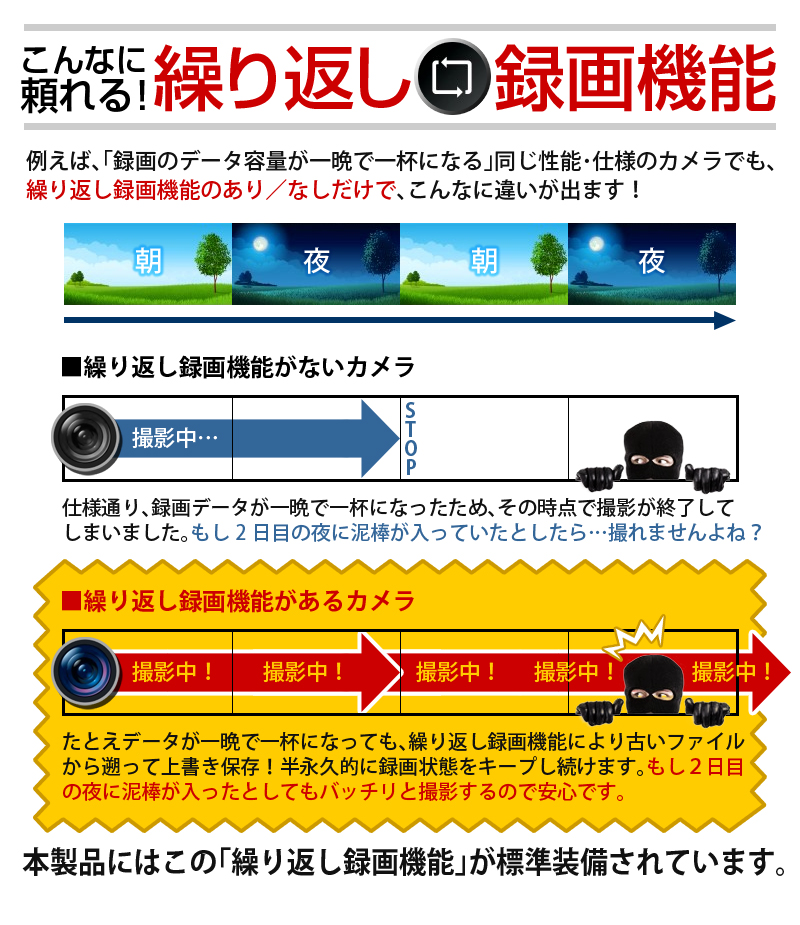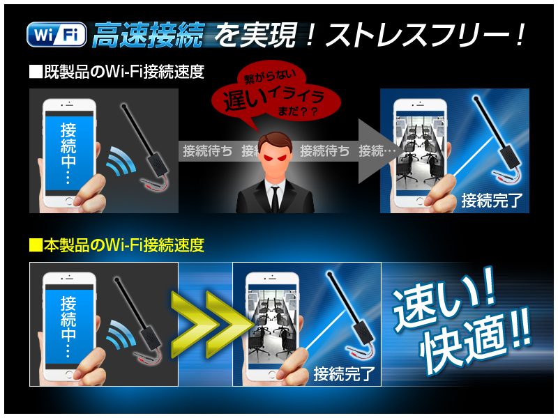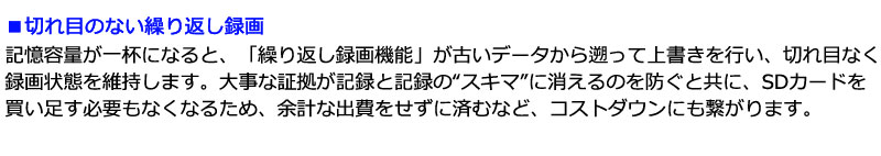 ・Wi-Fi カメラ本体通信 遠隔操作 ・Wi-Fi ルーター通信 遠隔操作 ・Wi-Fi 3G 4G LTE通信 遠隔操作 ・スマートフォン遠隔操作 ・スマートフォン再生機能 ・HD720P規格 動画撮影 ・H.264 | MPEG-4 AVC High Profile コーデック ・AVI動画ファイル ・フレームレート25FPS(最大) ・広角150°レンズ ・静止画撮影 ・暗視補正機能 ・繰返し録画機能 ・動体検知録画機能 ・外部電源 24時間連続録画機能 ・ファイル「超」高速転送 ・microSDカード最大128GB対応 ・撮影ファイル スマートフォン保存機能 ・撮影ファイル microSDカード保存機能 ・高音質マイク ・簡単操作 ・詳細設定機能 └日付自動設定機能 └コントラスト設定機能 └明るさ設定機能 └マイク音量設定機能 └ビデオ撮影ファイル時間設定 |