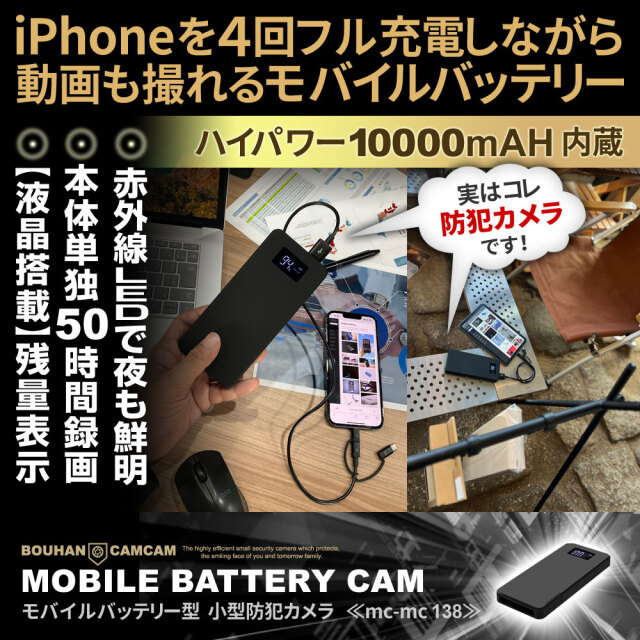 [mc-mc138][モバイルバッテリー型] 50時間連続録画 夜間撮影も対応 実際にスマホ充電可能
