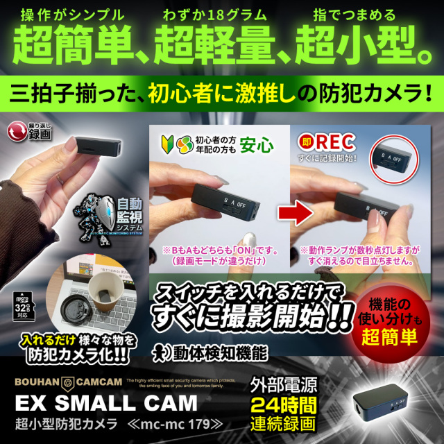 【半額SALE対象商品】[mc-mc179] [超小型] 軽量18g 初心者におすすめ 超簡単操作 動体検知機能 24時間連続録画